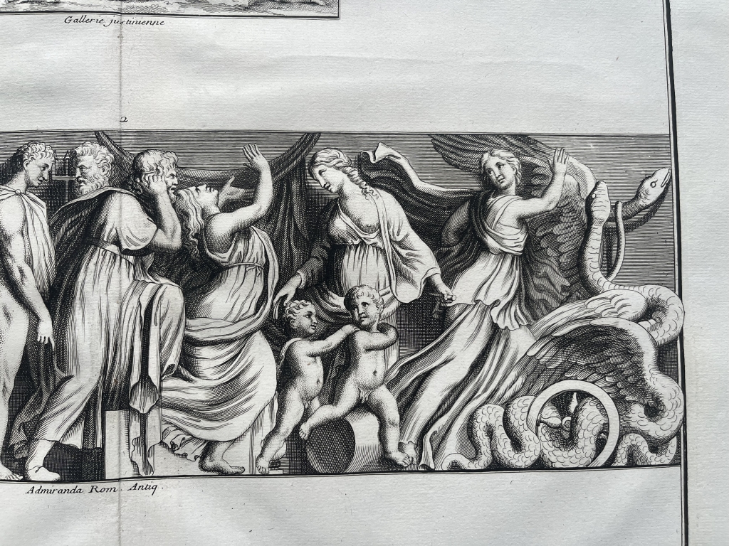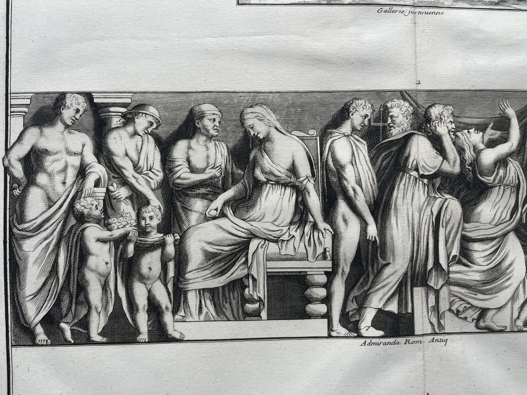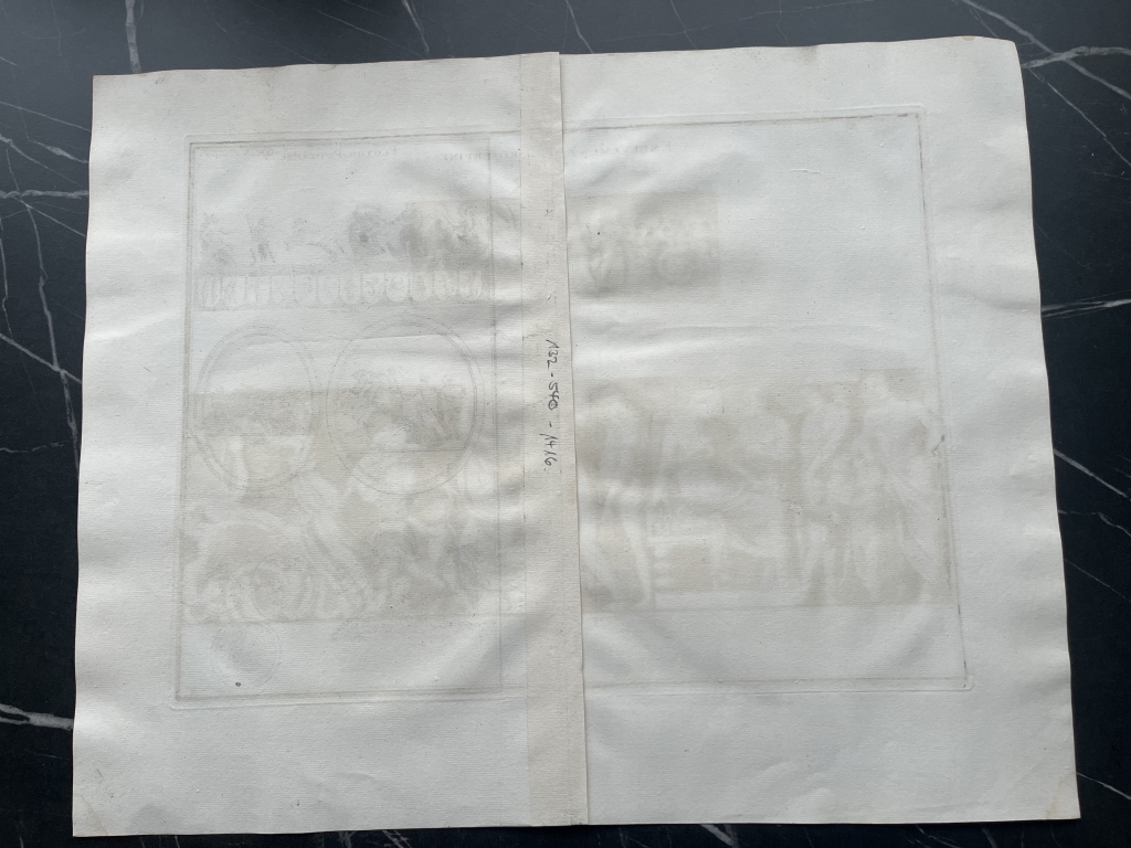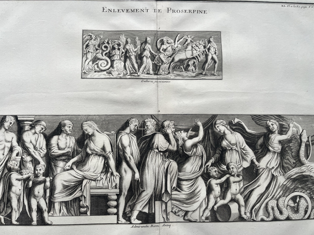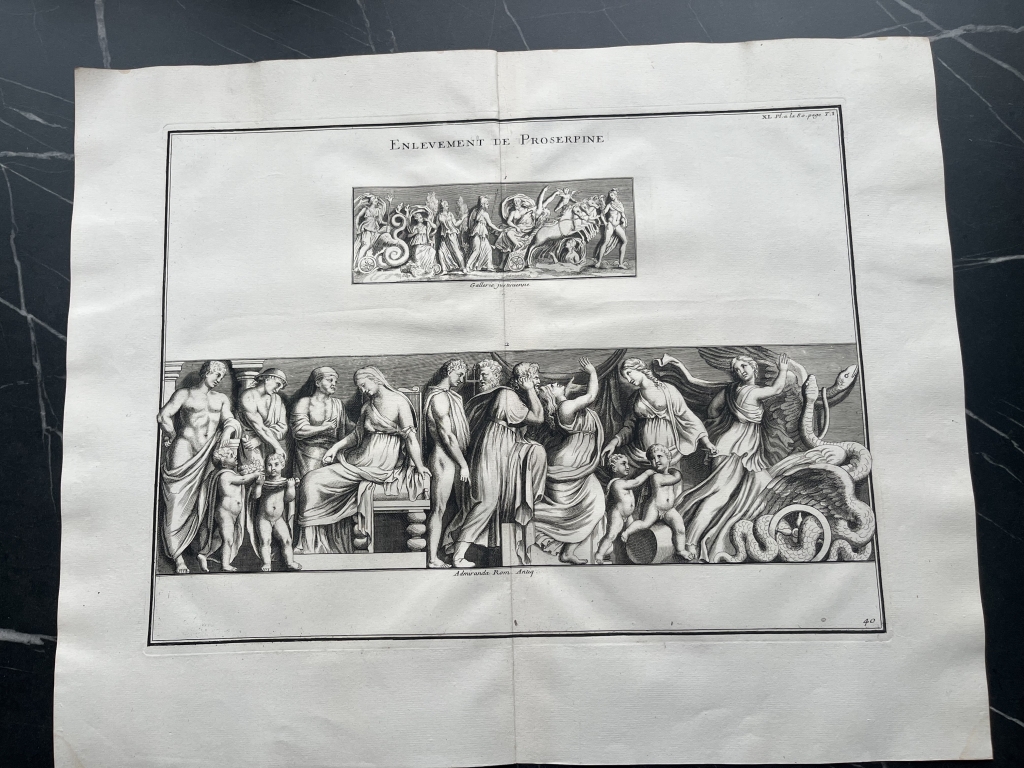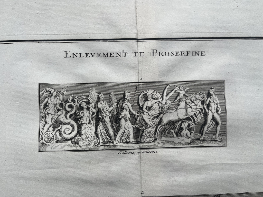 Se nos muestra en este grabado de gran formato, a doble página, que lleva por breve título “"Enlevement de Proserpine”, que como bien dice tu título nos muestra el “Rapto de Proserpina”, escena mitológica muy representada en la mitología romana. Podemos ver la escena procedente de dos relieves romanos, que presentan diversos personajes ilustrando el mencionado pasaje mitológico, con múltiples detalles de los participantes: personas con diferentes actitudes, animales,..