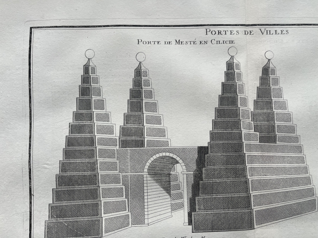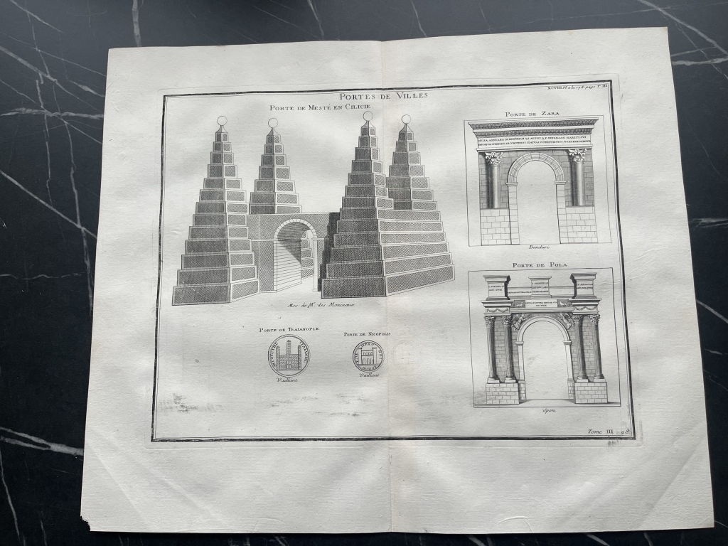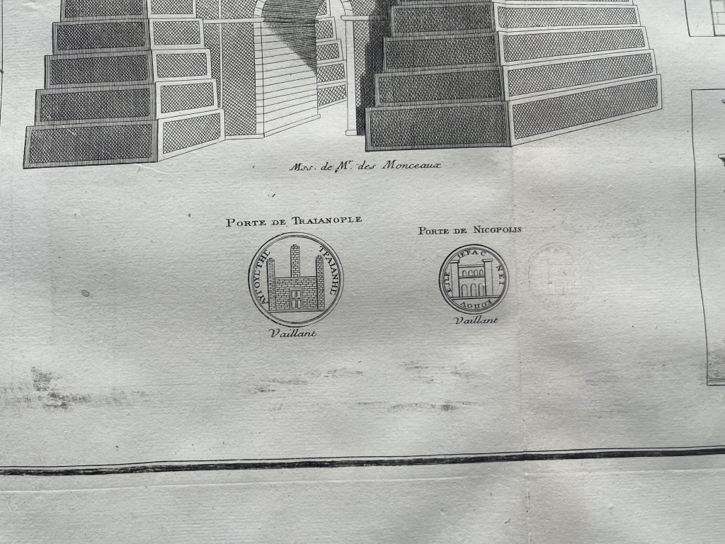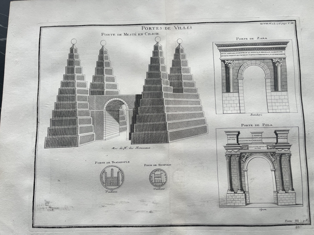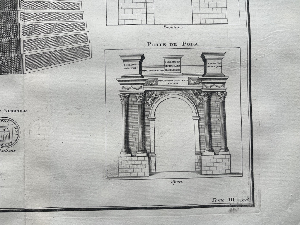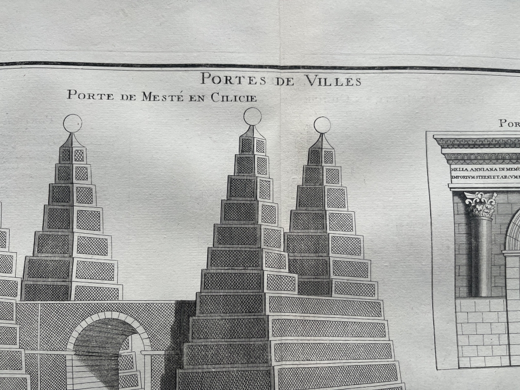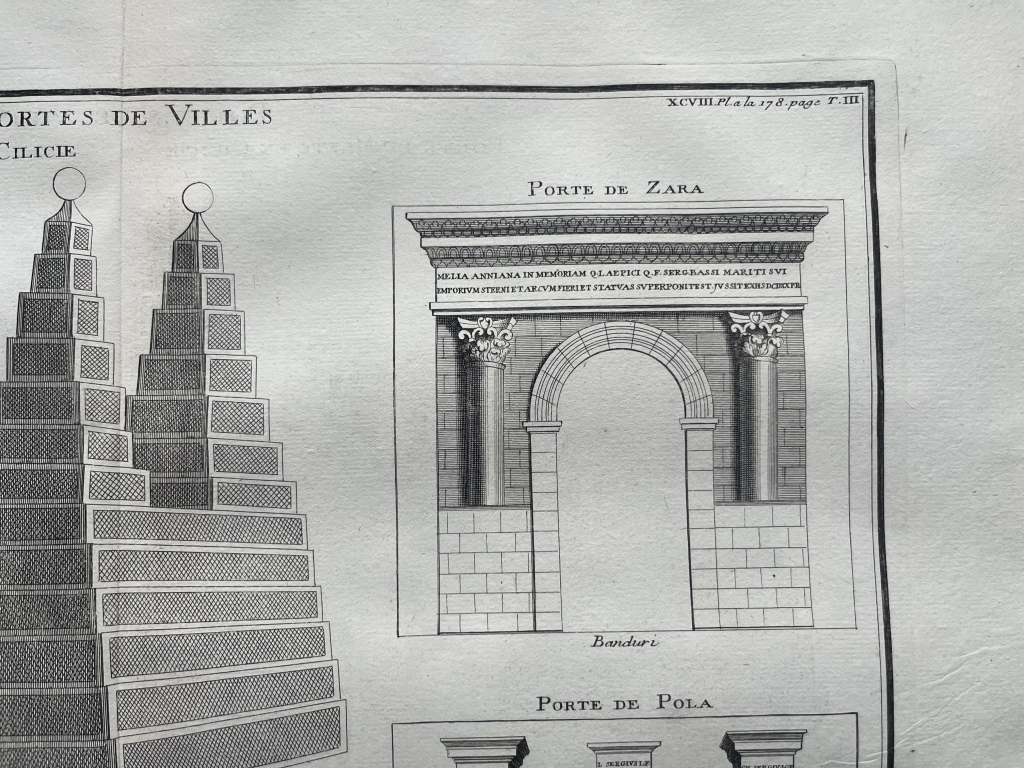 Se nos muestra en este grabado de gran formato, a doble página, que lleva por breve título “Portes de villes”, varias representaciones de diferentes entradas o puertas de varias ciudades de época romana, como se puede ver de diferente tipología. Se refiere concretamente en las de Meste en Cilicia (Turquía), Zara y Pula (Croacia), Trainópolis (Grecia) y Nicópolis (Bulgaria). Tres tomadas por su restos y dos de ellas por su figura en monedas romanas.