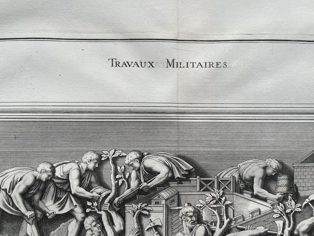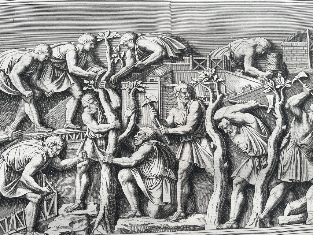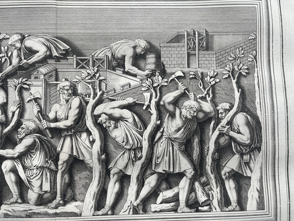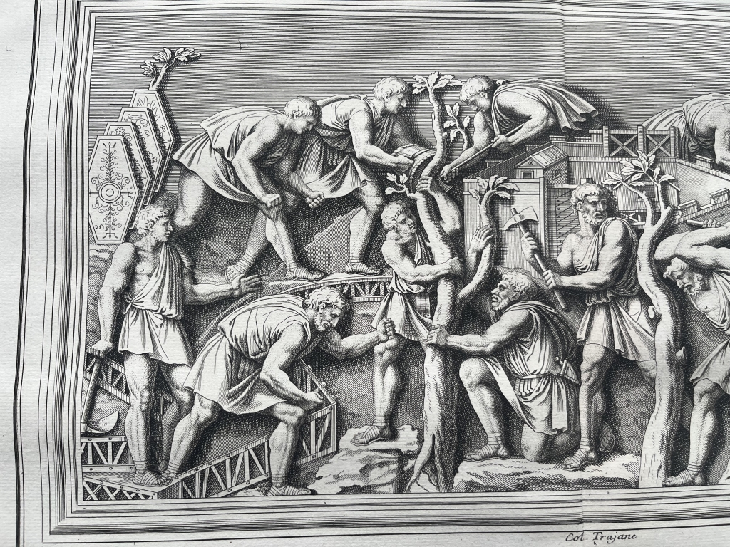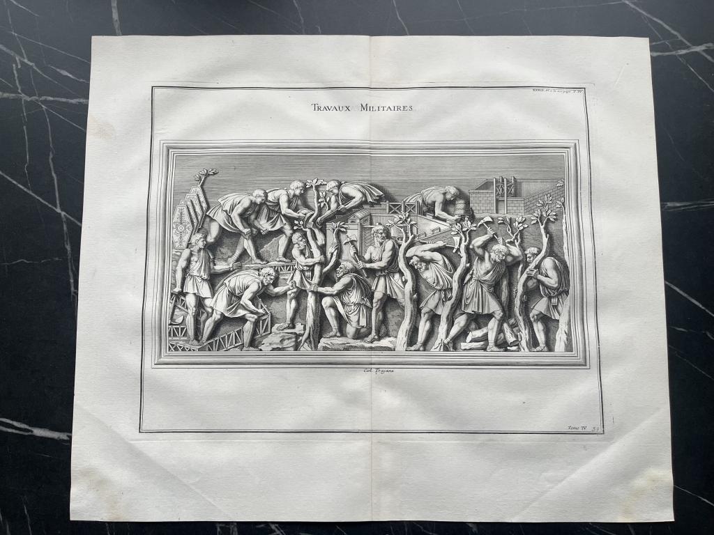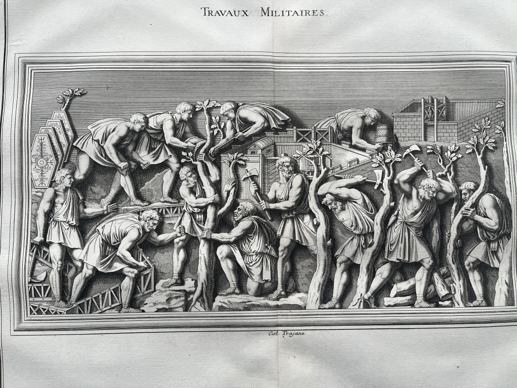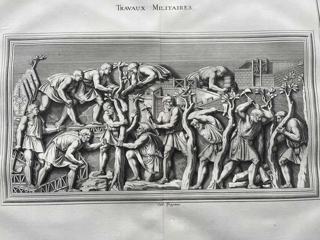 Se nos muestra en este grabado de gran formato, a doble página, que lleva por breve título “Travaux militaires”, diversos trabajos realizados por legionarios romanos para levantar una fortificación. Así vemos como, están cortando árboles, colocando los mismos y otras labores para el levantamiento de una construcción militar. Esta escena está tomada del relieve de la famosa columna del emperador Trajano, de Roma. Son muy interesantes las vestimentas y los utensilios empleados por los militares para estas tareas.
