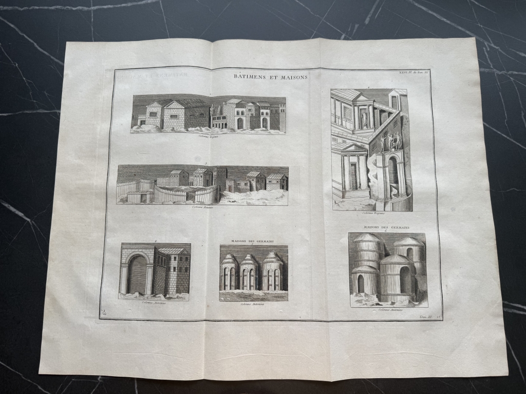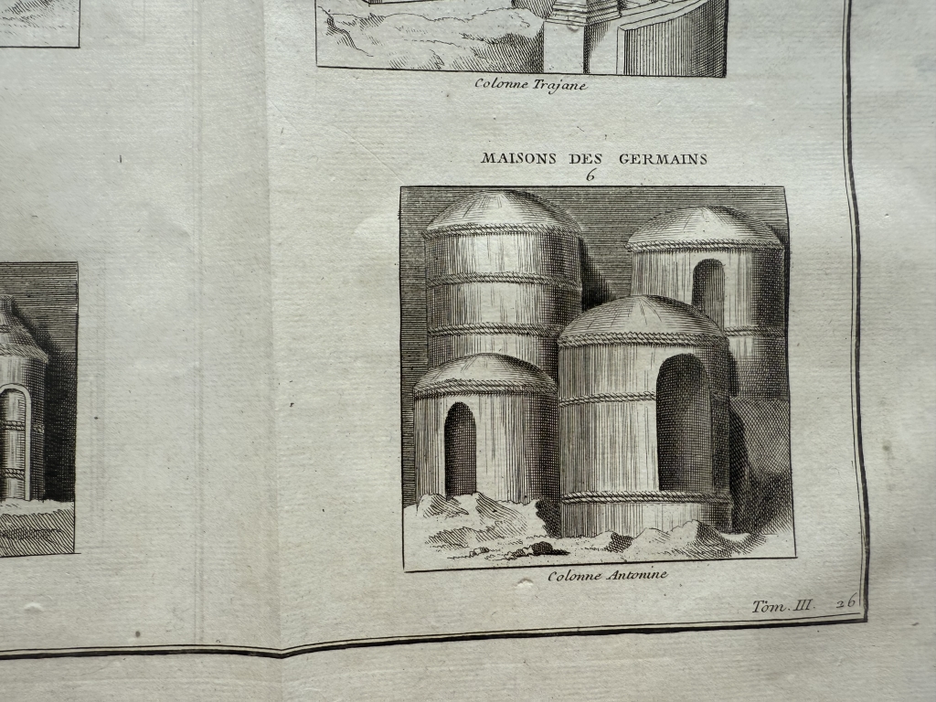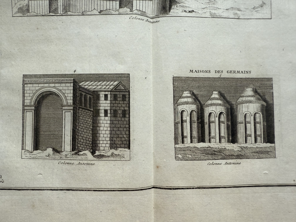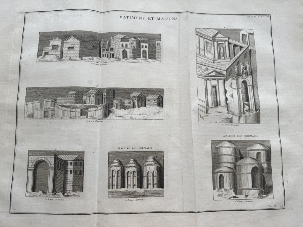 Se nos muestra en este grabado de gran formato, a doble página, que lleva por breve título “Bâtimens et Maisons ”, en el que podemos ver, como bien dice su título, varios ejemplos de edificios y casas romanas y de los germanos, tomadaS de los relieves de las famosas columnas conmemorativas denominada trajana y antonina, de Roma. Podemos observar las diferentes que nos viene dadas por su complejidad o su sencillez, en su mayoría agrupadas en pequeños barrios.