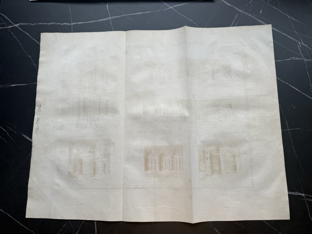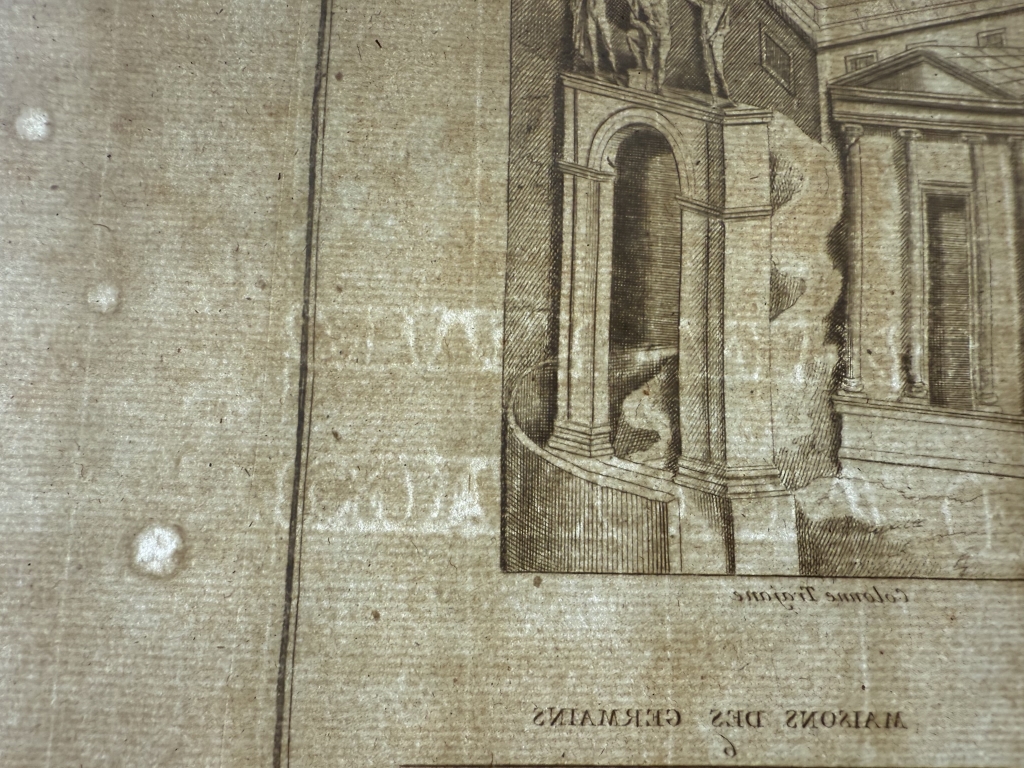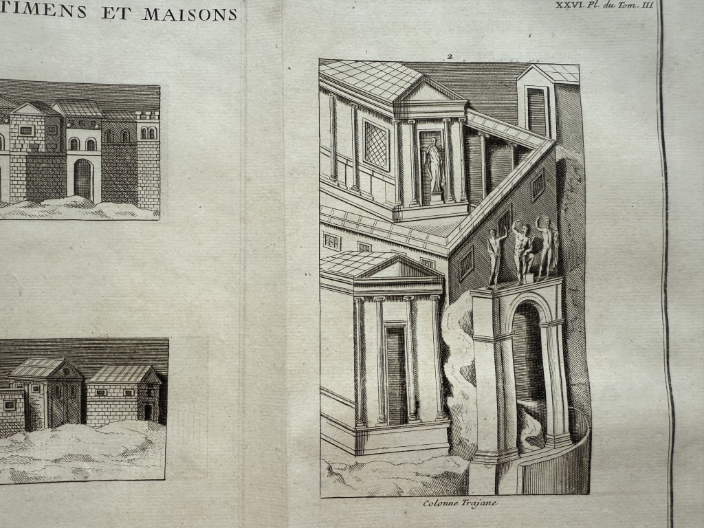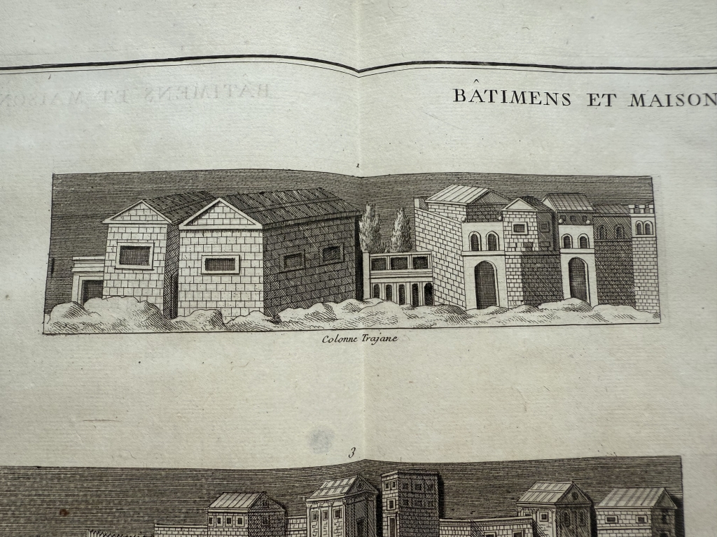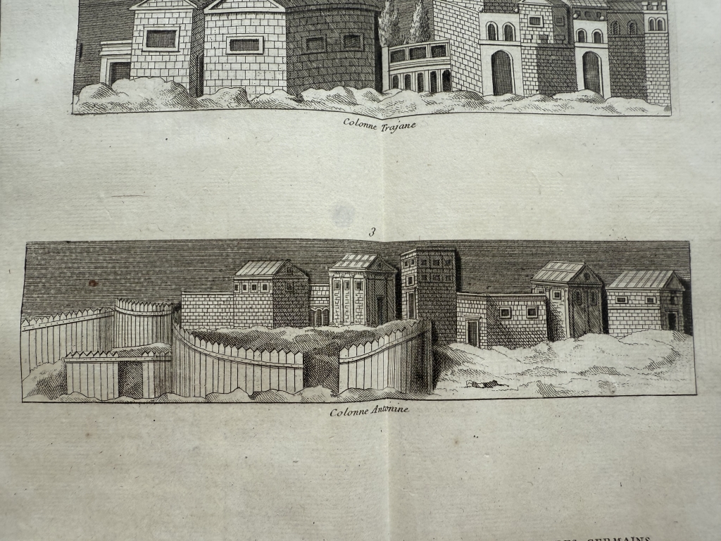 Se nos muestra en este grabado de gran formato, a doble página, que lleva por breve título “Bâtimens et Maisons ”, en el que podemos ver, como bien dice su título, varios ejemplos de edificios y casas romanas y de los germanos, tomadaS de los relieves de las famosas columnas conmemorativas denominada trajana y antonina, de Roma. Podemos observar las diferentes que nos viene dadas por su complejidad o su sencillez, en su mayoría agrupadas en pequeños barrios.