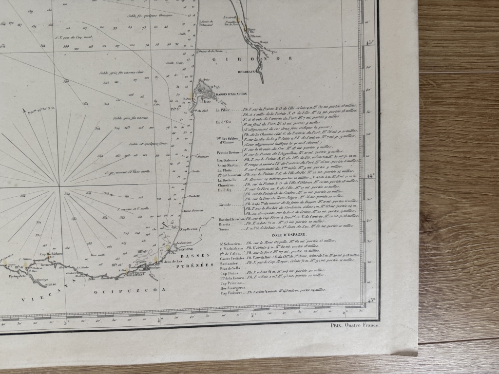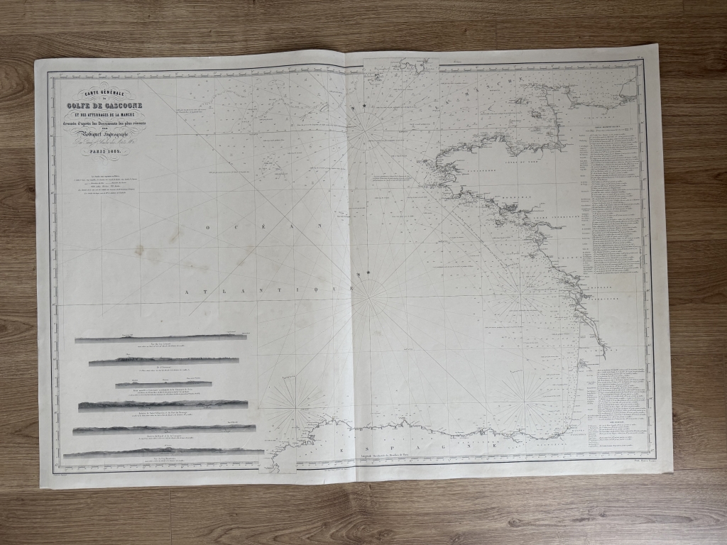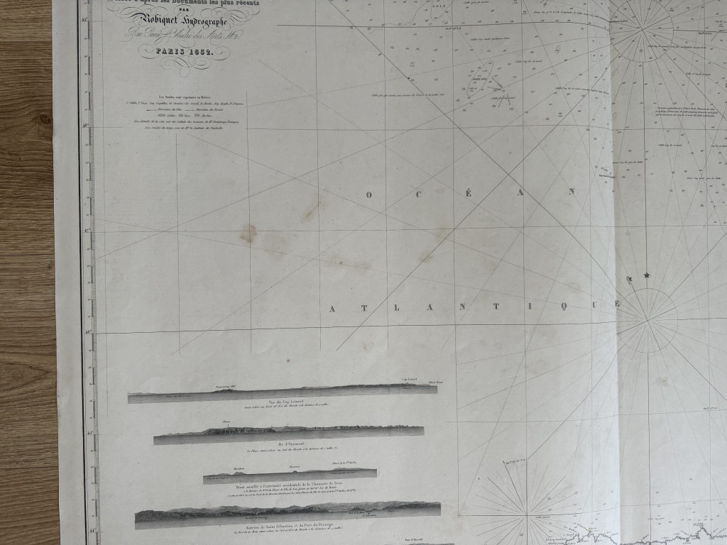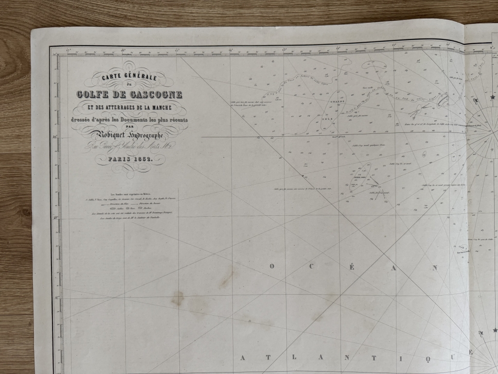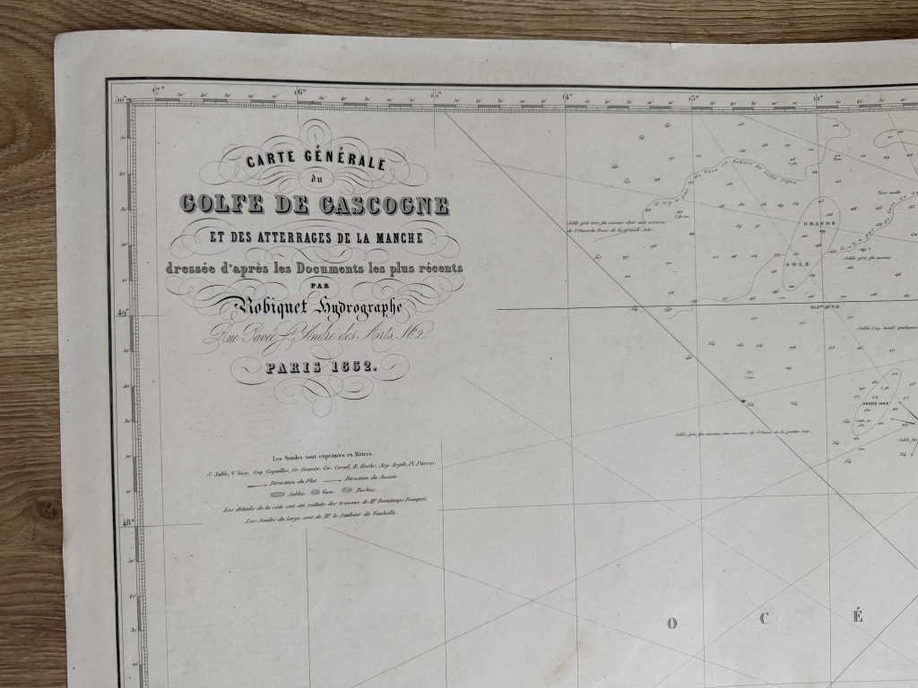 Título original: Carte générale du Golfe de Gascogne et des Atterrages de la Manche dressée d'après les Documents les plus récents Par Robiquet Hydrographe Rue Pavée André des Arts N° 2 Paris 1852.