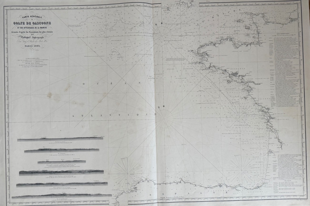 Título traducido: Carta general del Golfo de Gascuña y de las Tierras de la Mancha, elaborada después de los Documentos más recientes, por Robiquet, Hidrógrafo, Rue Pavée André des Arts N.° 2, París, 1852.