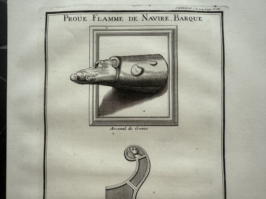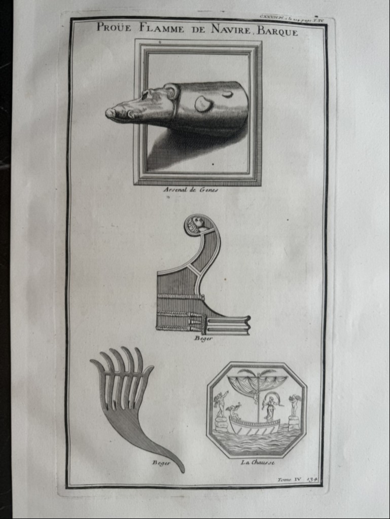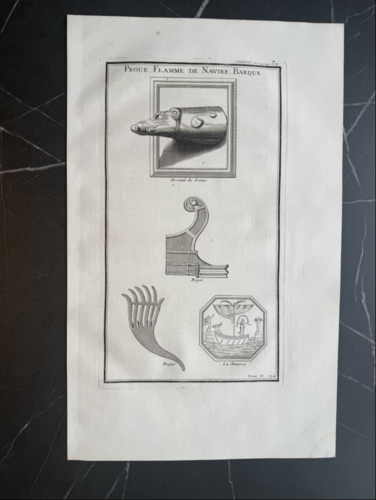 Se nos muestra en este grabado de gran formato, a toda página, que lleva por breve título “ Proue Flamme de Navire, Barque, en el que podemos ver, como bien dice su título, varios ejemplos de tres proas de barcos romanos: el primero en forma de ariete, para facilitar la destrucción de la otra nave; y los otros dos, en forma de llama, más decorativos; y un representación completa de un barco romano