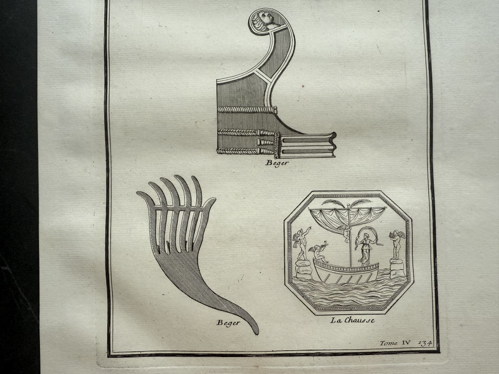 Grabado de placa de cobre de Bernard de Montfaucon (1655-1741), extraído de su gran obra titulada “ L’Antiquite Expliquée et Représentée en Figures.- Tomo IV, Segunda parte. Editada en París, por Delaulne y Foucault, en 1719. Primera edición.