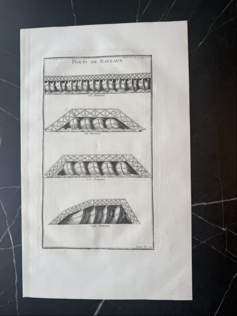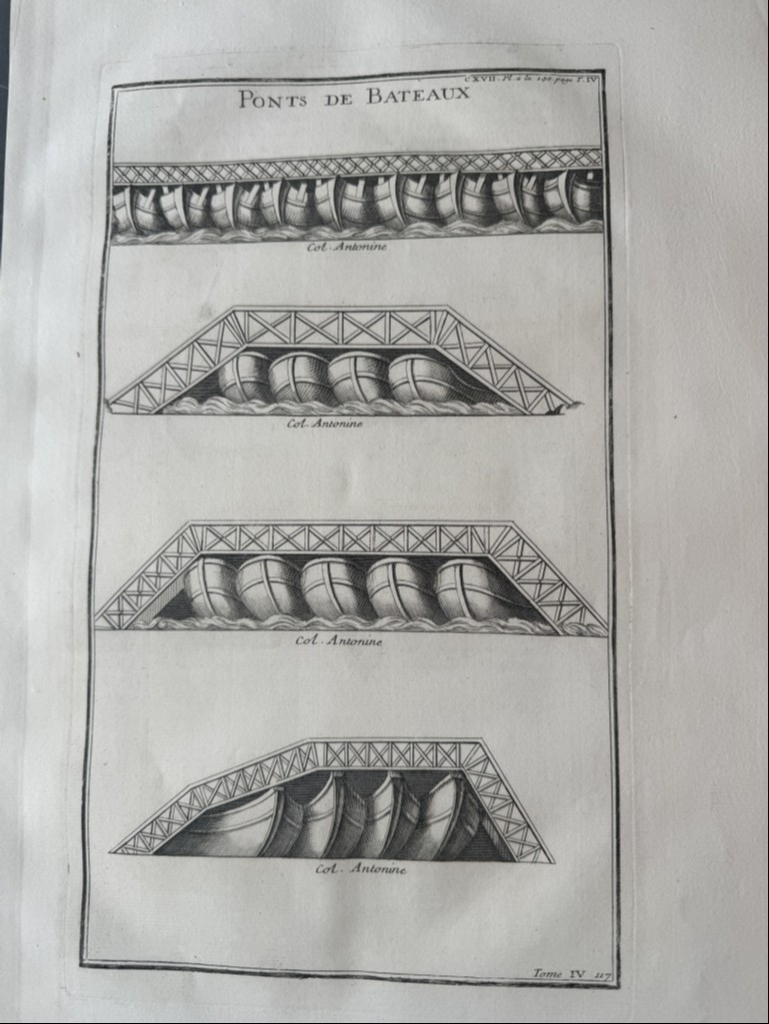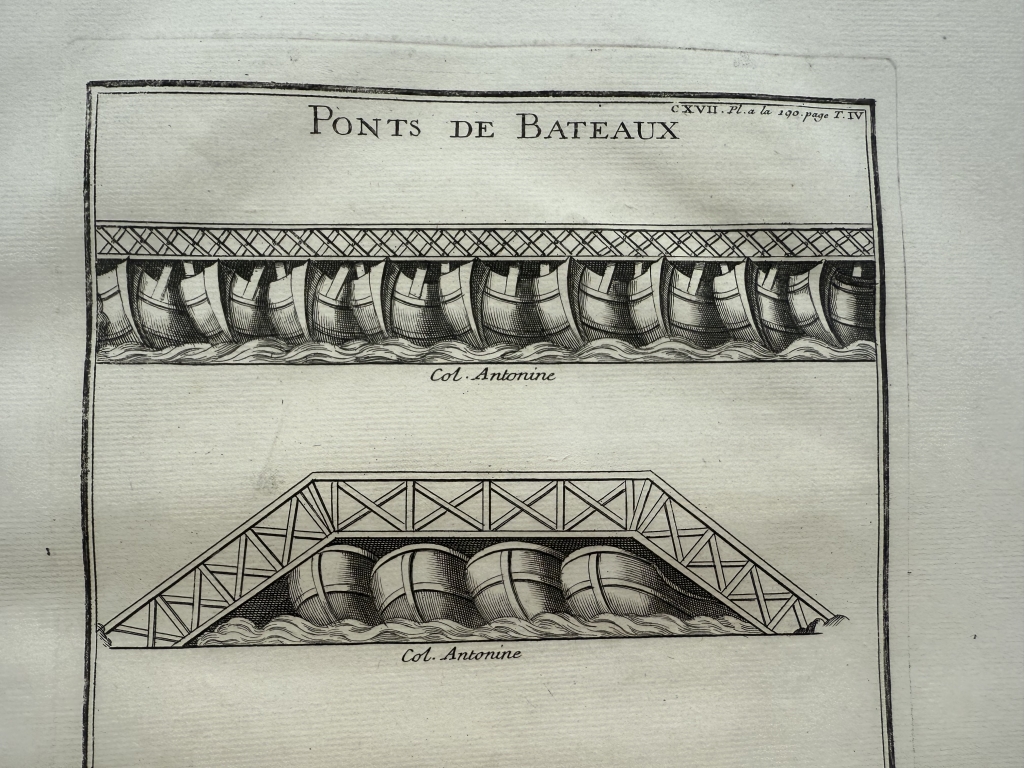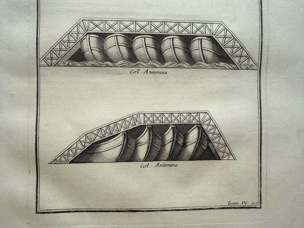 Se nos muestra en este grabado de gran formato, a toda página, que lleva por breve título “Ponts de Bateaux”, en el que podemos ver, como bien dice su título, diferentes tipos de puentes de barcas romanos destinado a para atravesar ríos en sus campañas militares, tomados de unas escenas de relieves de la famosa columna antoniana de Roma. En concreto se nos muestran cuatro tipos de puentes, con distinto número de barcas que lo forman, pero muy similares los unos con los otros.