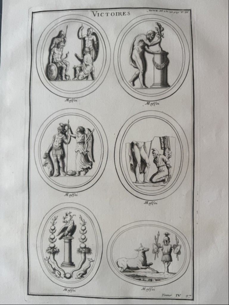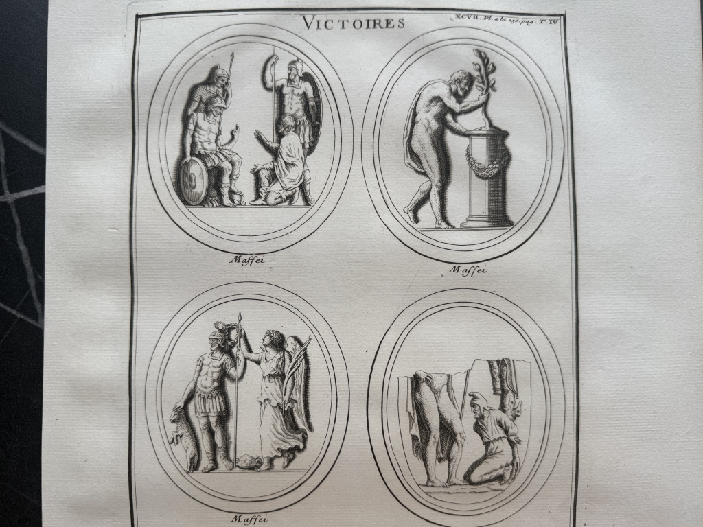 Se nos muestra en este grabado de gran formato, a toda página, que lleva por breve título “Victories”, en el que podemos ver, como bien dice su título, diferentes representaciones de la diosa Victoria en la mitología romana. En concreto se trata de seis escenas o representaciones distintas de la diosa tomada de diferentes monedas romanas, pertenecientes a diferentes colecciones numismáticas de dicha época.