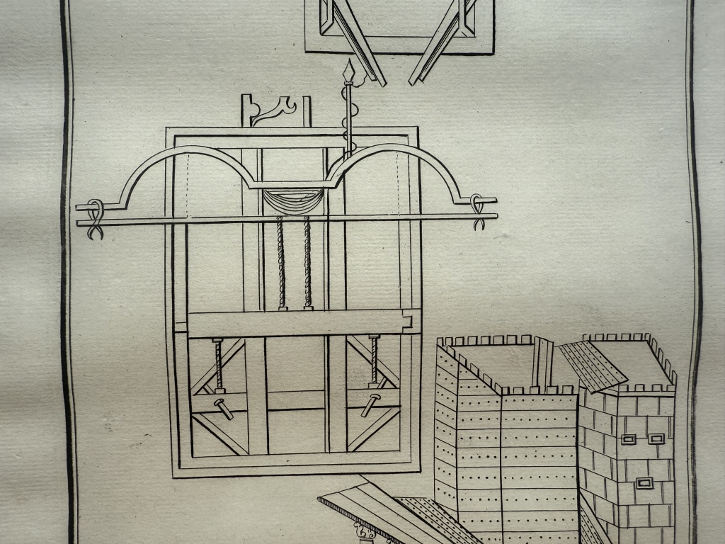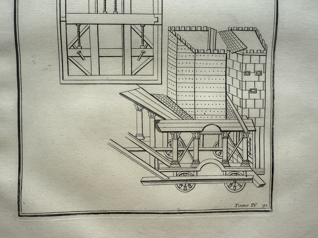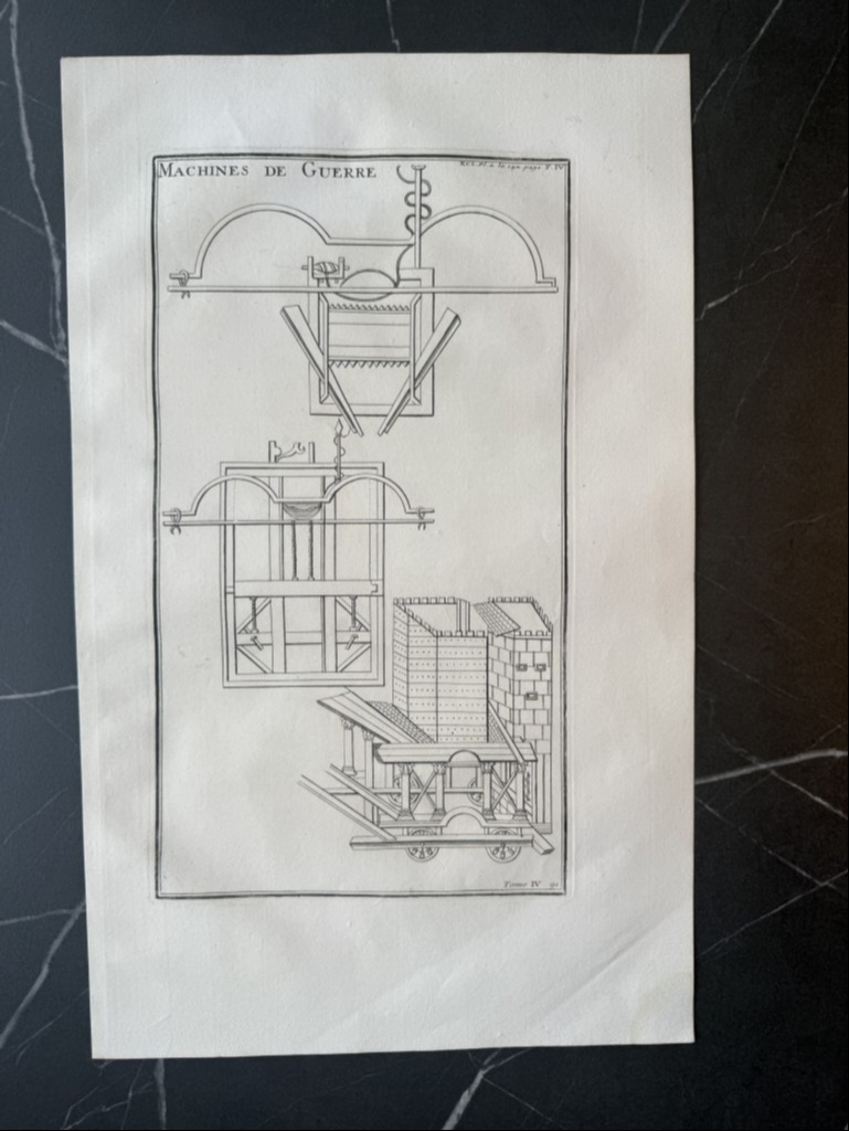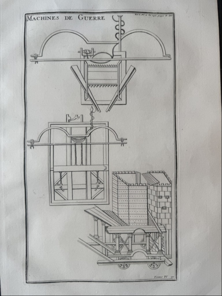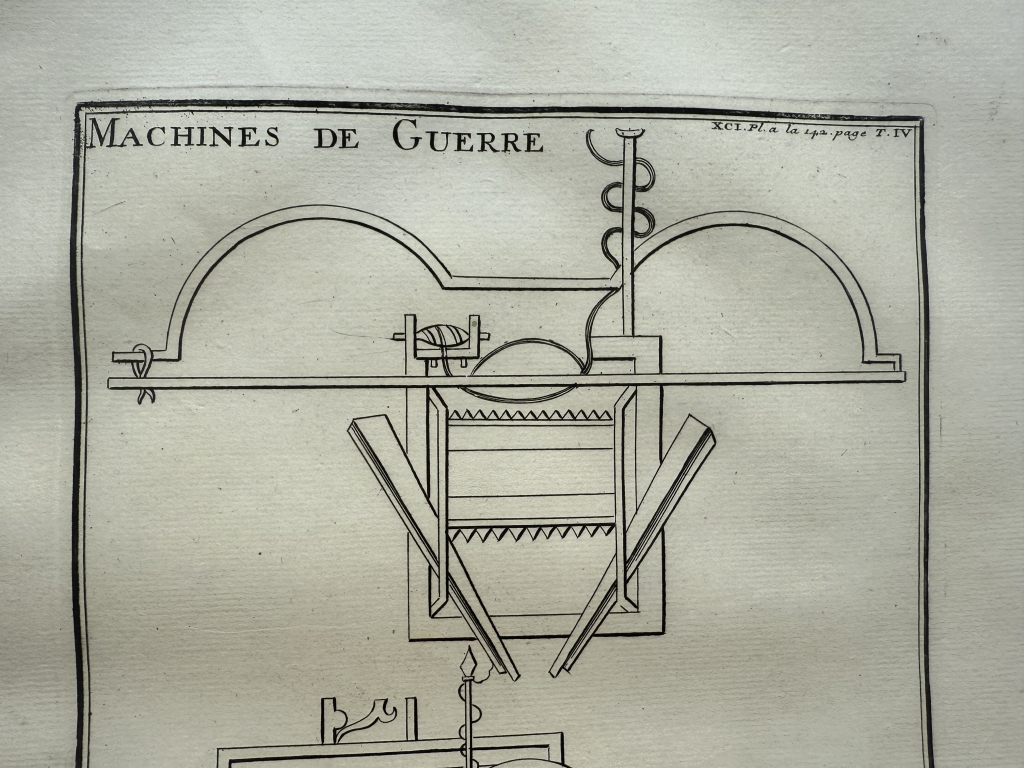 Se nos muestra en este grabado de gran formato, a toda página, que lleva por breve título “Machines de guerre, en el que podemos ver, como bien dice su título, diversos tipos de maquinas militares de guerra utilizada en época romana, por los legionarios en su ataques. Se pueden apreciar con detalle, en que consistían las mismas.