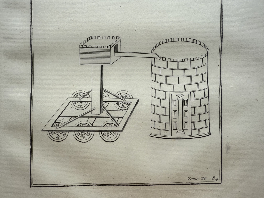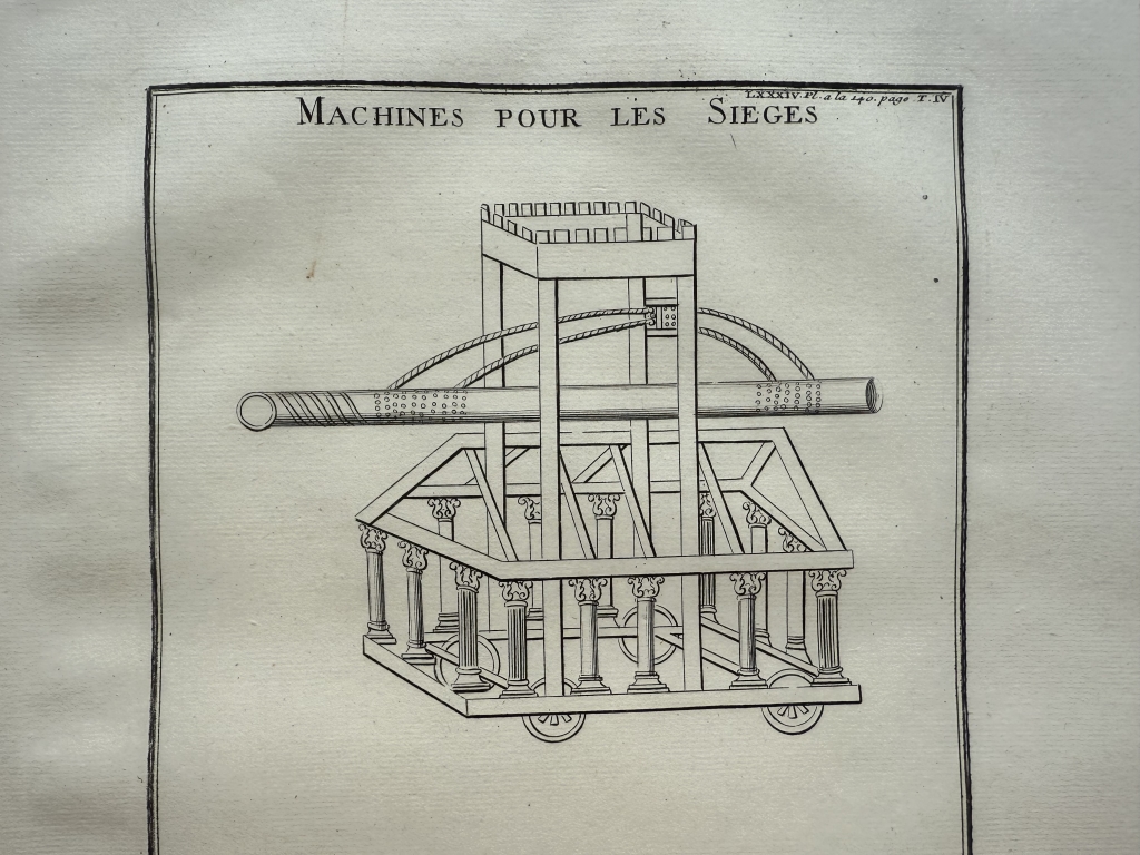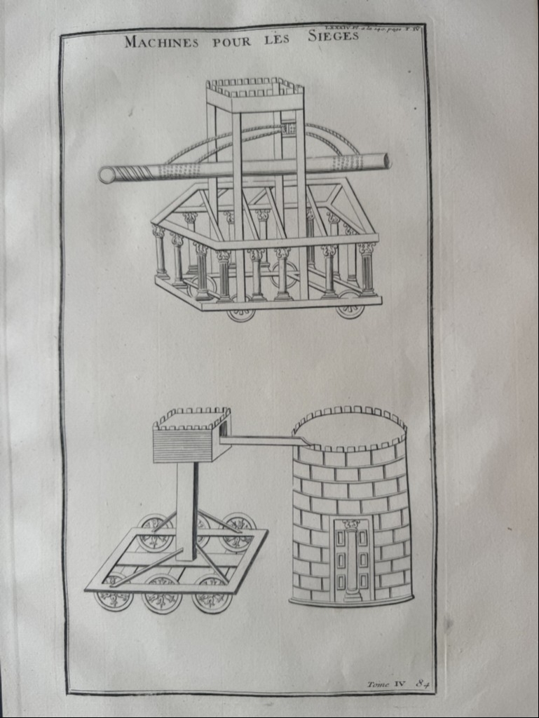 Se nos muestra en este grabado de gran formato, a toda página, que lleva por breve título “Machines pour les sieges”, en el que podemos ver, como bien dice su título, maquinas utilizadas para el sitio o asedio de los enemigos, en concreto, dos de estos artefactos militares, uno a modo de gran ariete rodante y el otro, una torre de asalto también con ruedas, utilizados en época romana, por los legionarios en su ataques. Se pueden apreciar con detalle, en que consistían las mismas.