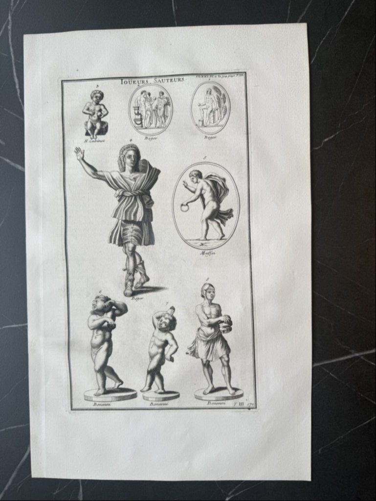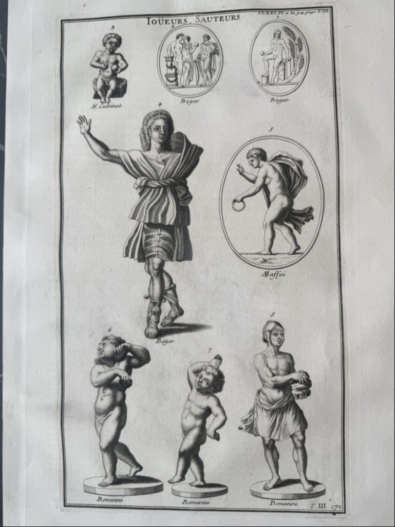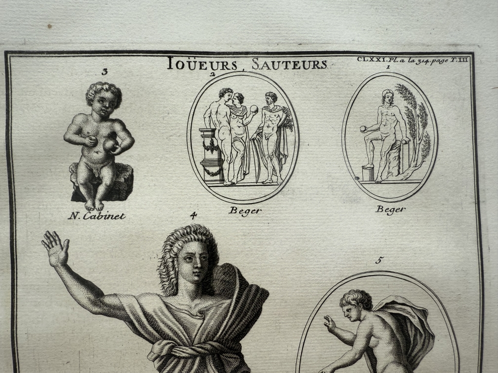 Se nos muestra en este grabado de gran formato, a toda página, con título “Ioueurs, Sauteurs“, nos muestra diferentes personajes jugando con diferentes objetos, como bolas, aros,… en diferentes posiciones y actitudes, representaciones tomadas de hallazgos romanos de la época.