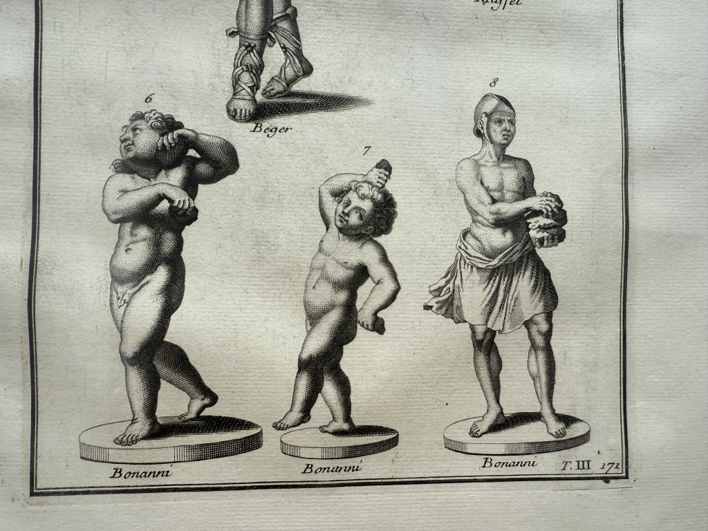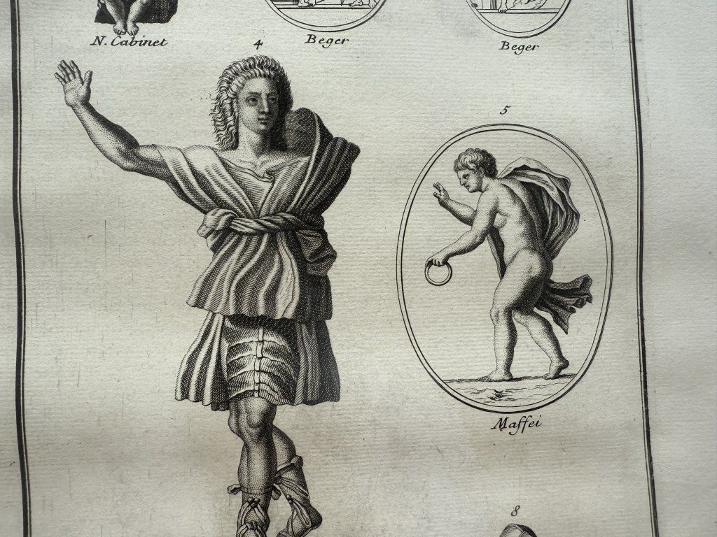 Grabado de placa de cobre de Bernard de Montfaucon (1655-1741), extraído de su gran obra titulada “"L'Antiquité Expliquée et Représentée. Tomo III. Segunda parte. Editada en Paris, por Delaulne & Foucault, en 1719. Primera edición.