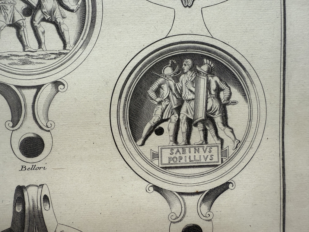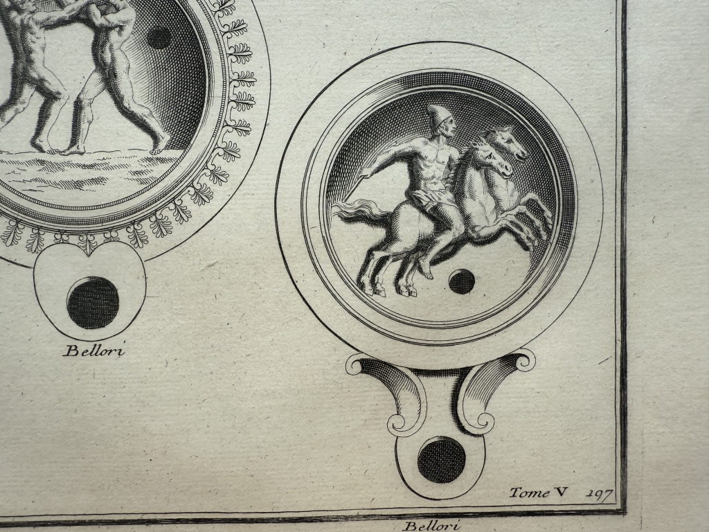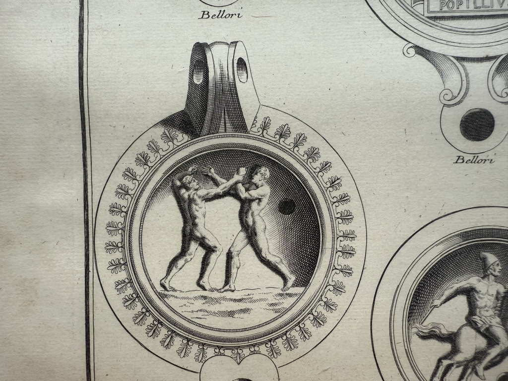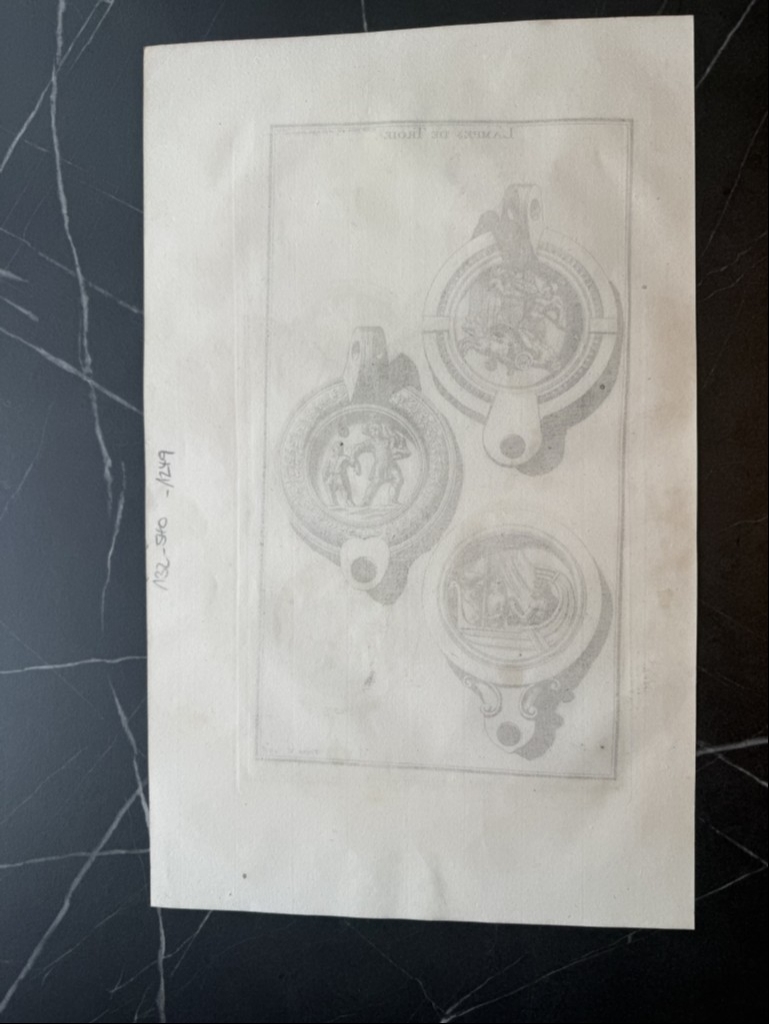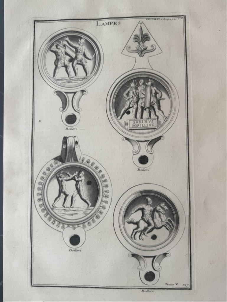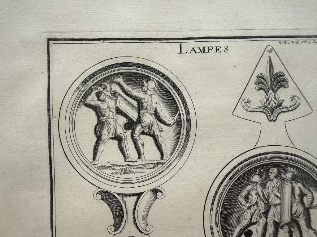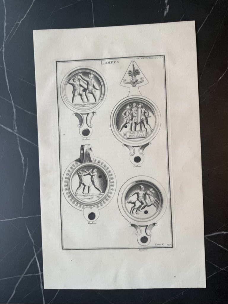 Se nos muestra en este grabado de gran formato, a toda página, con el título en la parte superior “Lampes”, como bien menciona este enunciado, varias lucernas romanas, como se llamaban en la época romana a las lámparas o candiles de aceite, que presentan diferentes decoraciones: dos muestran a hombres armados pelean entre ellos; en otra, podemos ver la pelea o lucha de dos hombres desnudos y sin armas; y en la cuarta, un personaje montado a caballo. Se pueden apreciar muy bien, los detalles de cada una de ellas