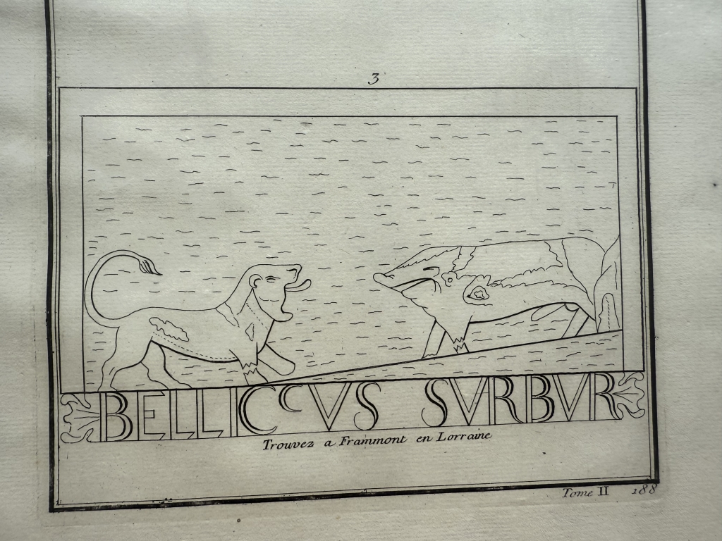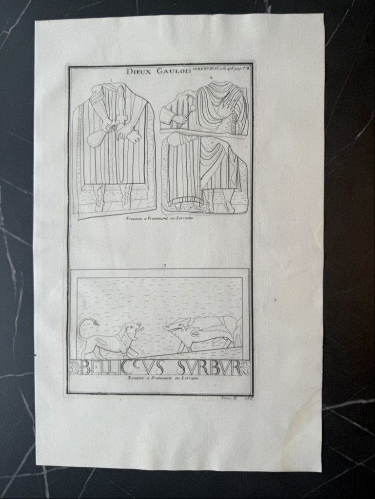 Se nos muestra en este grabado de gran formato, a toda página, con el título en la parte superior “Dieux gaulois, varias representaciones correspondiente a relieves romanos encontrados en la Galia ( Francia en época romana), que son interpretados como dioses o divinidades adoradas por los galos. En la parte superior, tenemos a dos personajes vestidos, a los que le falta la cabeza; y en la parte inferior, dos animales enfrentados, con una inscripción romana debajo de los mismo. Se pueden apreciar muy bien, los detalles de cada una de ellas