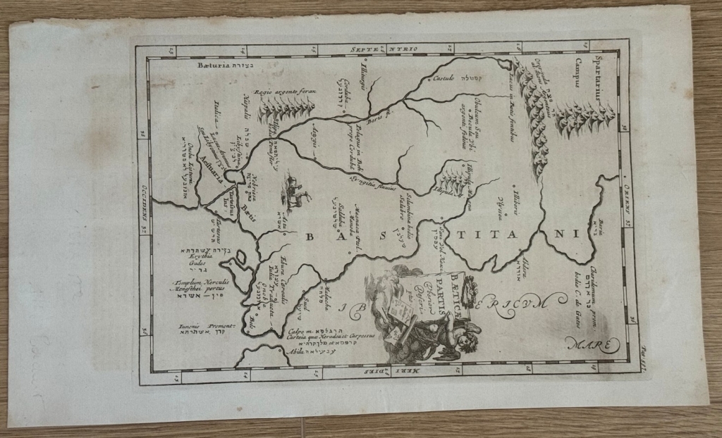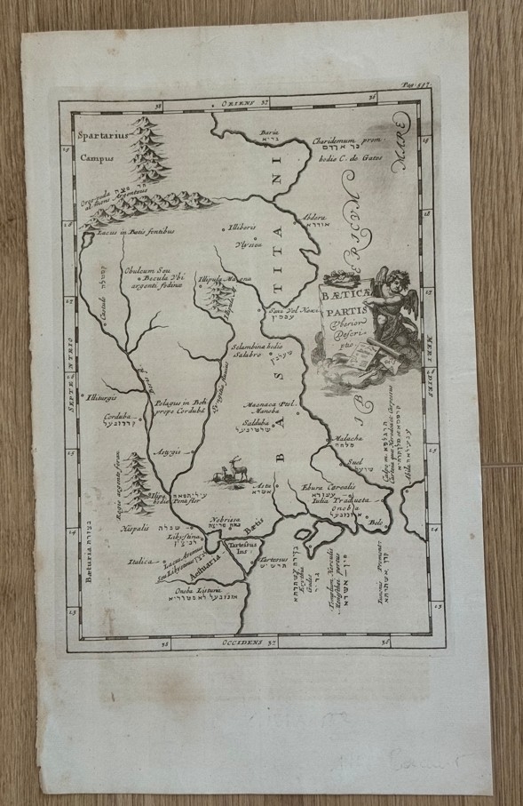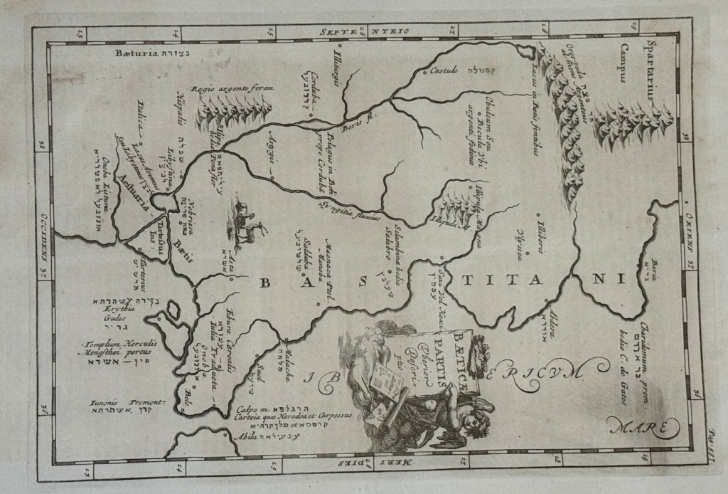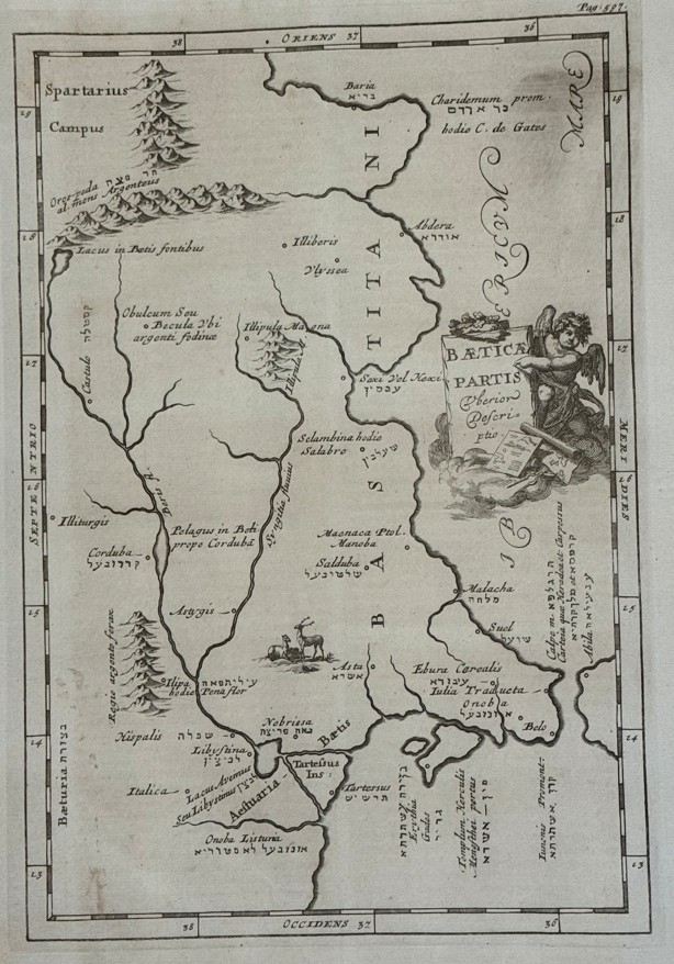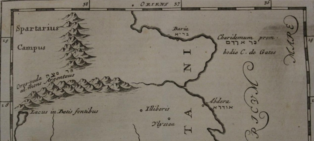 “Este mapa forma parte del Italiae pars cum vicinis hinc inde Insulis et Africa parte opposita, que incluía el Hispania at Africa pars Occidentalis, que contenía a su vez el Baeticae partis uberior descriptio, fechado en 1681. Es un doble mapa que posteriormente se subdividió en dos: la parte italiana por un lado y, por otro, el territorio español, la zona noroccidental de África y Andalucía. En su origen el mapa formaba parte de la Geographia Sacra seu Phaleg et Canaan de Samuel Bochart (1599- 1667), obra realizada en dos volúmenes y que se publicó en 1646, aunque tuvo varias ediciones posteriores que enriquecieron tanto los mapas como el texto que los acompañaban.