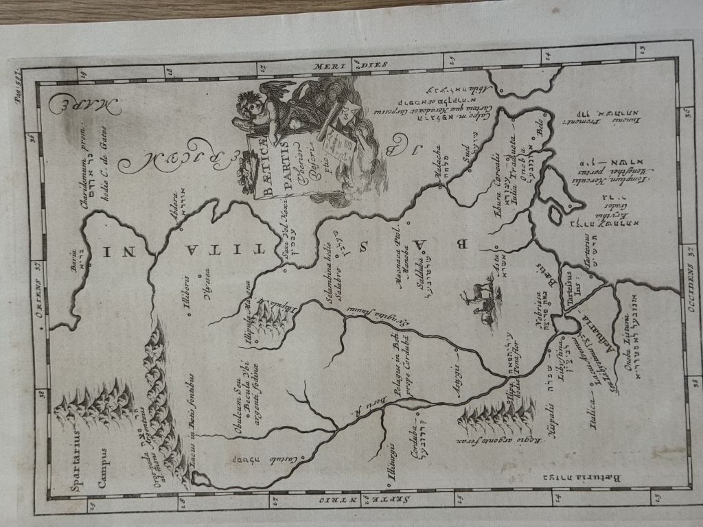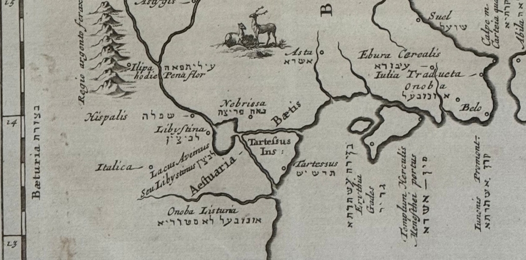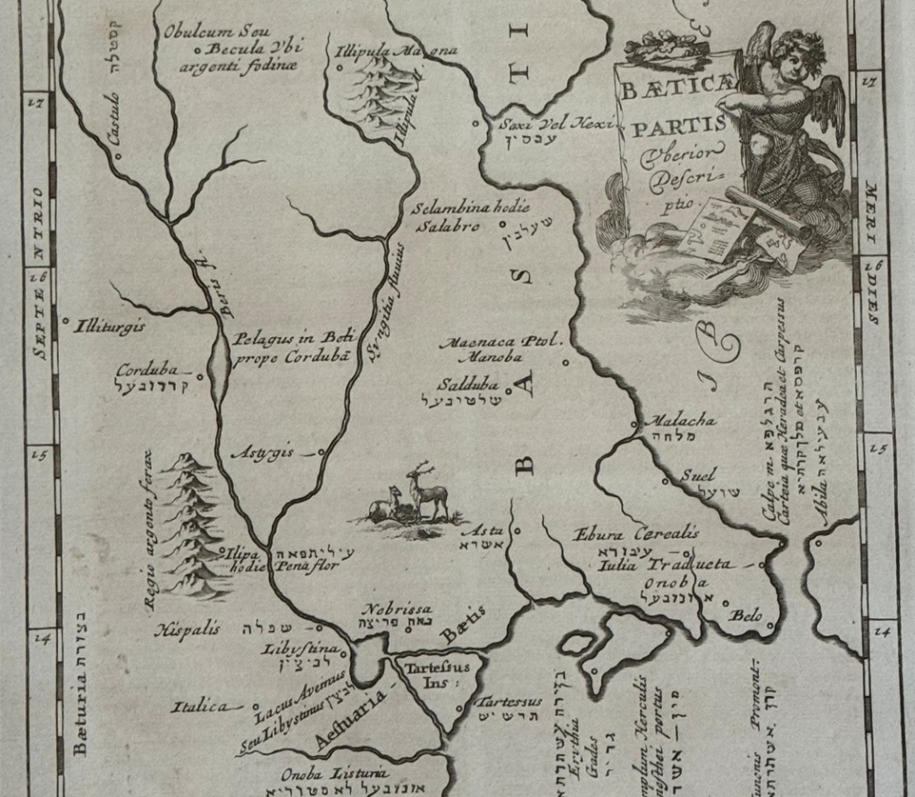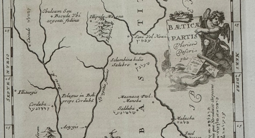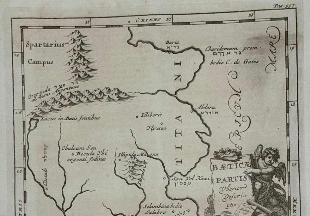 “Este mapa forma parte del Italiae pars cum vicinis hinc inde Insulis et Africa parte opposita, que incluía el Hispania at Africa pars Occidentalis, que contenía a su vez el Baeticae partis uberior descriptio, fechado en 1681. Es un doble mapa que posteriormente se subdividió en dos: la parte italiana por un lado y, por otro, el territorio español, la zona noroccidental de África y Andalucía. En su origen el mapa formaba parte de la Geographia Sacra seu Phaleg et Canaan de Samuel Bochart (1599- 1667), obra realizada en dos volúmenes y que se publicó en 1646, aunque tuvo varias ediciones posteriores que enriquecieron tanto los mapas como el texto que los acompañaban.