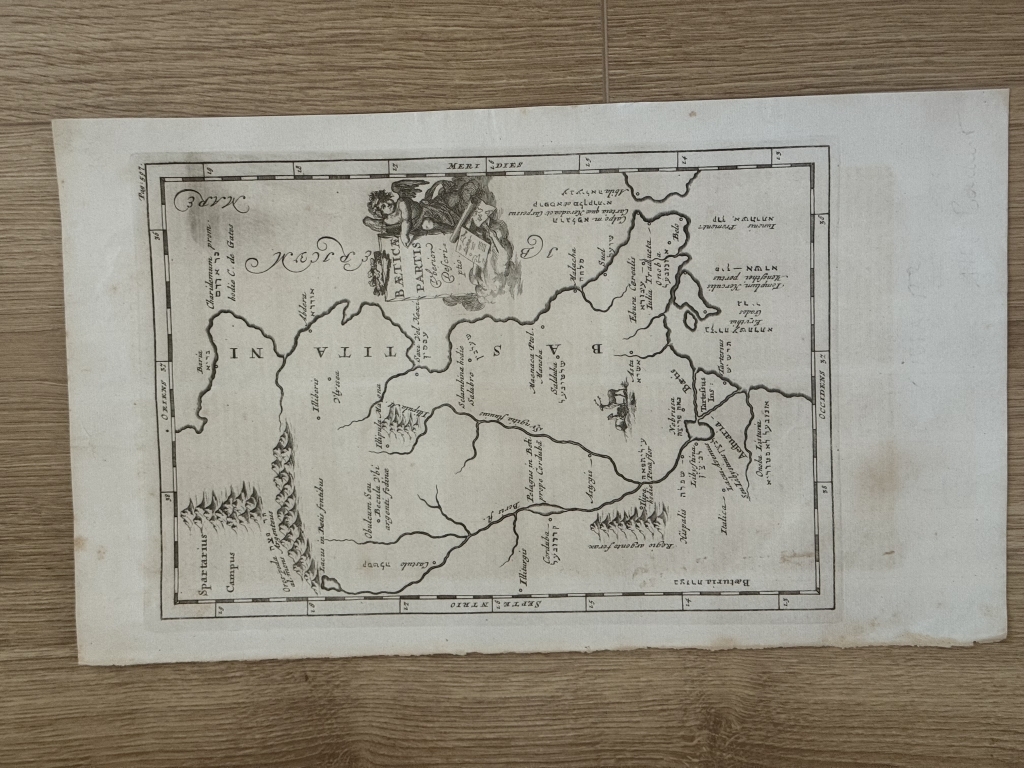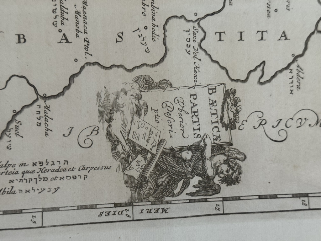 Por otra parte, el título del mapa está inserto en un tapiz sujetado por un angelote que lo flanquea por su derecha. A sus pies varios mapas dibujados sobre pergaminos y un compás completan esta ornamentada cartela. Está situada sobre el Ibericum Mare (Mar Ibérico) que fue uno de los distintos nombres que le dieron a esta parte del Mediterráneo. Finalmente, un marco graduado bordea el mapa. Está subdividido en grados, tanto para las longitudes como para las latitudes, compartimentados en 5 partes de 12 minutos cada uno de ellos. Los cuatro puntos cardinales están rotulados en latín en el medio de cada uno de los lados del marco.”