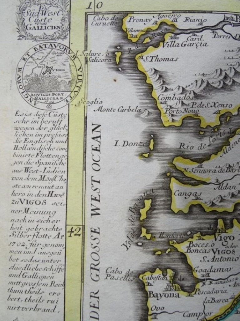 La cartografía, conmemorativa de la famosa batalla naval de Rande, muestra de manera muy detallada la parte suroeste de Galicia, Pontevedra (España) así como sus áreas adyacentes, donde podemos encontrar numerosos detalles, topográficos y geográficos, como ciudades, islas, ríos montañas... A ambos lados se encuentra adornado con unos dibujos, unas cartelas y con textos en alemán relativos al grabado.