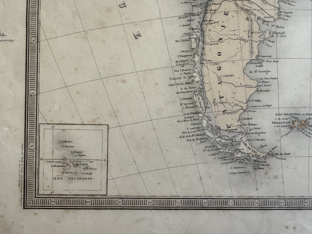 Se nos muestra en esta casrtografía, de gran tamaño y a color, toda la América del sur, con sus múltiples accidentes geográficos y ciudades más importantes de ka época, dentro de un decorativo marco. En la parte inferior-derecha, poseemos un recuadro con las que denomina “Tierras australes” y encima del mismo, las escalas utilizadas. Al otro lado, en otro recuadro, se nos muestra un pequeño mapa de las islas Galápagos.