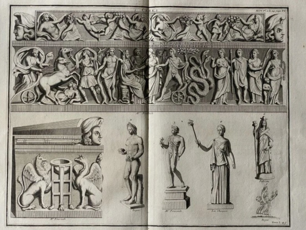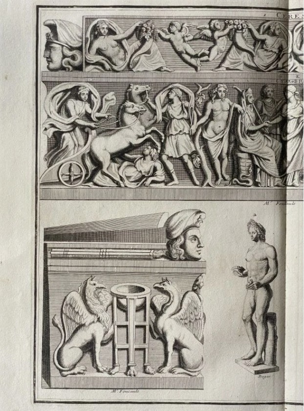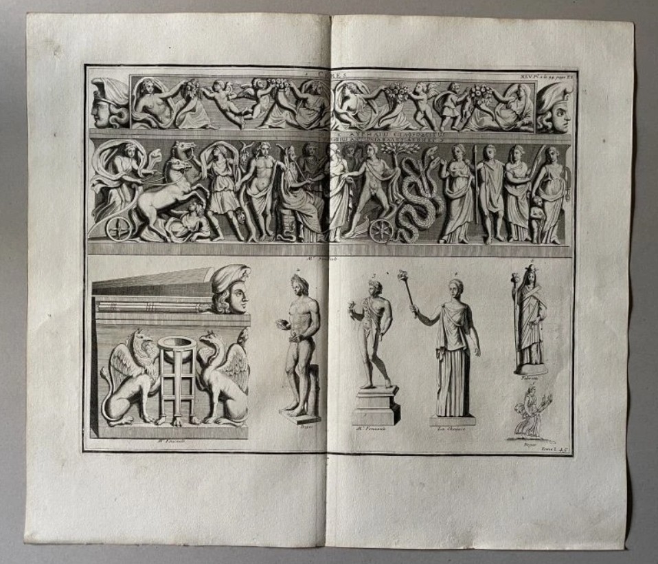 Este grabado de gran formato nos presentan relieves y esculturas romanas relacionadas a la diosa Ceres, asociada en la mitología clásica romana a la agricultura (su nombre deriva de los cereales) y a Demeter, en la griega.