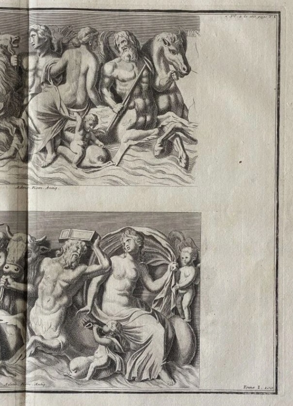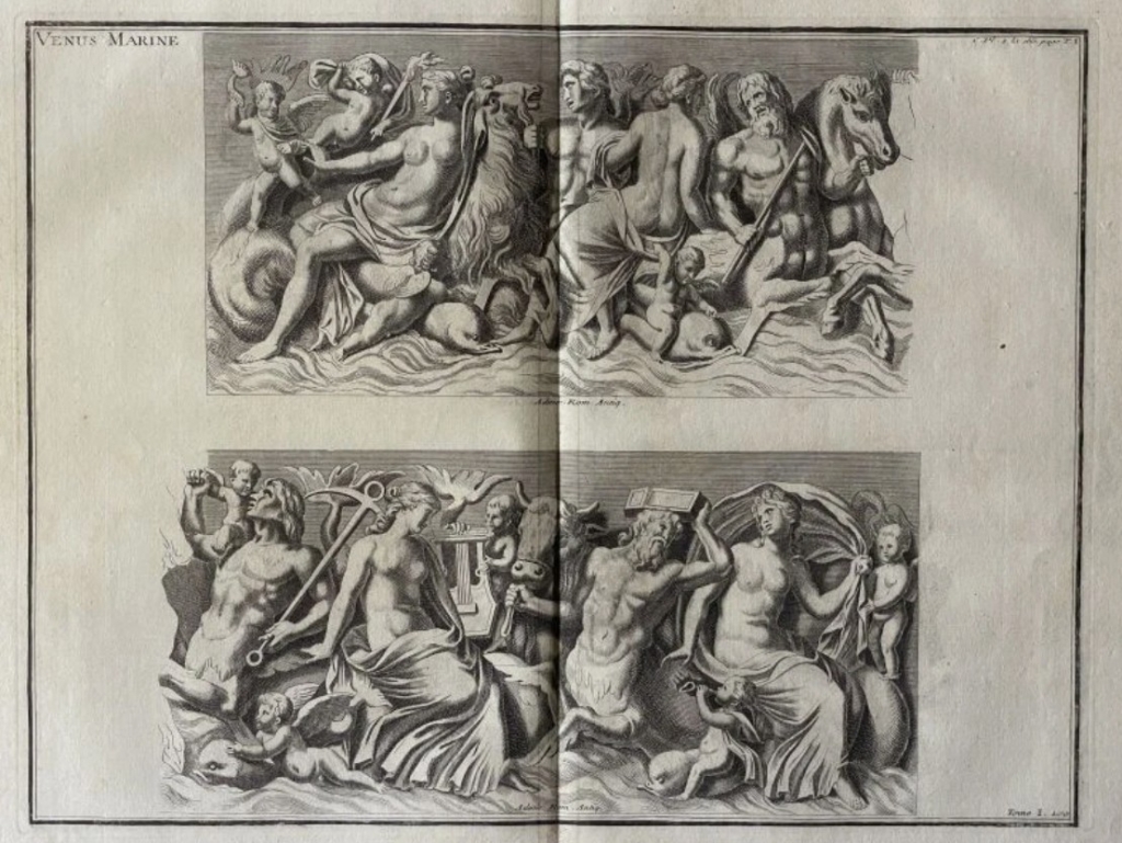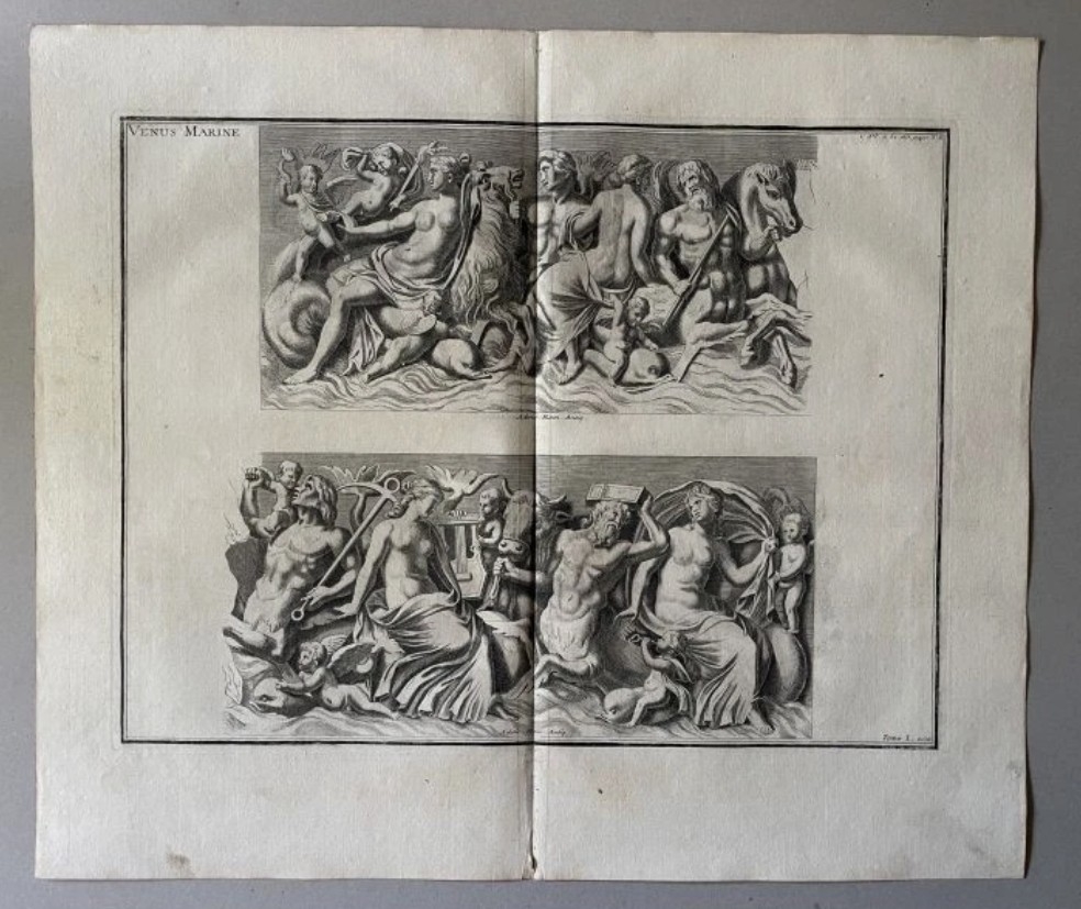 Gran grabado de placa de cobre, que lleva por título “Venus marina”, extraído de la obra de Bernard de Montfaucon, titulada “L´Antiquité expliquée et representée en figures. Tome premier. Les Dieux des Grecs et des Romains. Premiere Partie." publicada en Paris en 1722.
