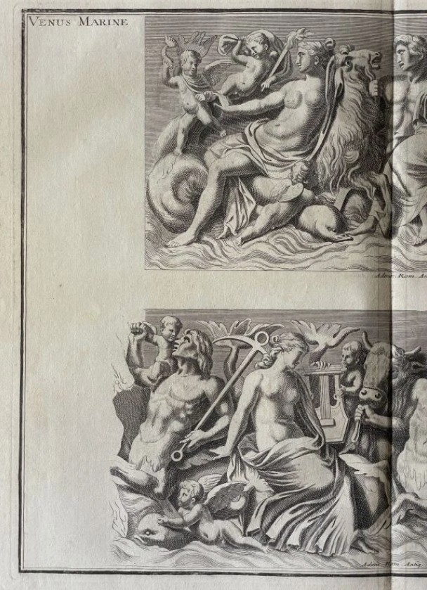 En este grabado de gran formato, nos presenta dos escenas de la mitología romana, relacionadas a la diosa Venus y sus lazos con el mar, acompañadas de diversos personajes en las imágenes representadas.