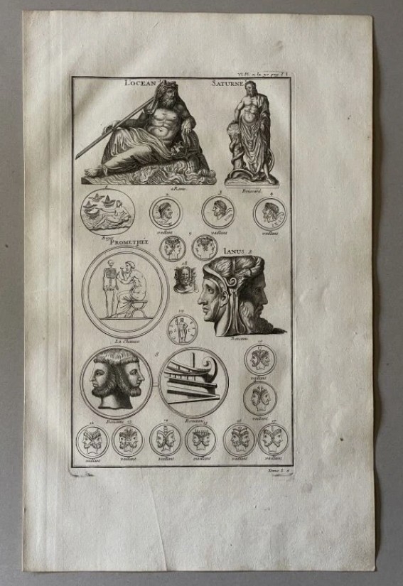Se trata de un lote de siete grabados de placa de bronce, extraídos de la monumental obra de Bernard de Montfaucon titulada "L'Antiquité expliquée et representée enfigures. Tome premier. Les Dieux des Grecs et des Romains. Premiere Partie", editada en Paris en 1722.