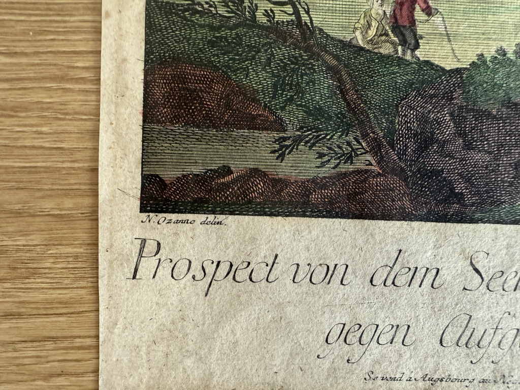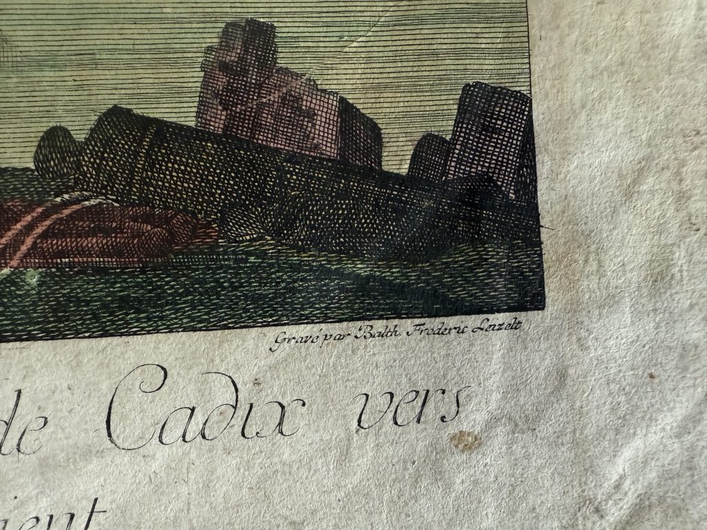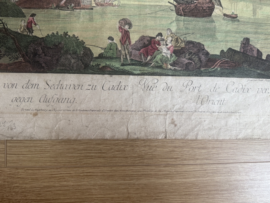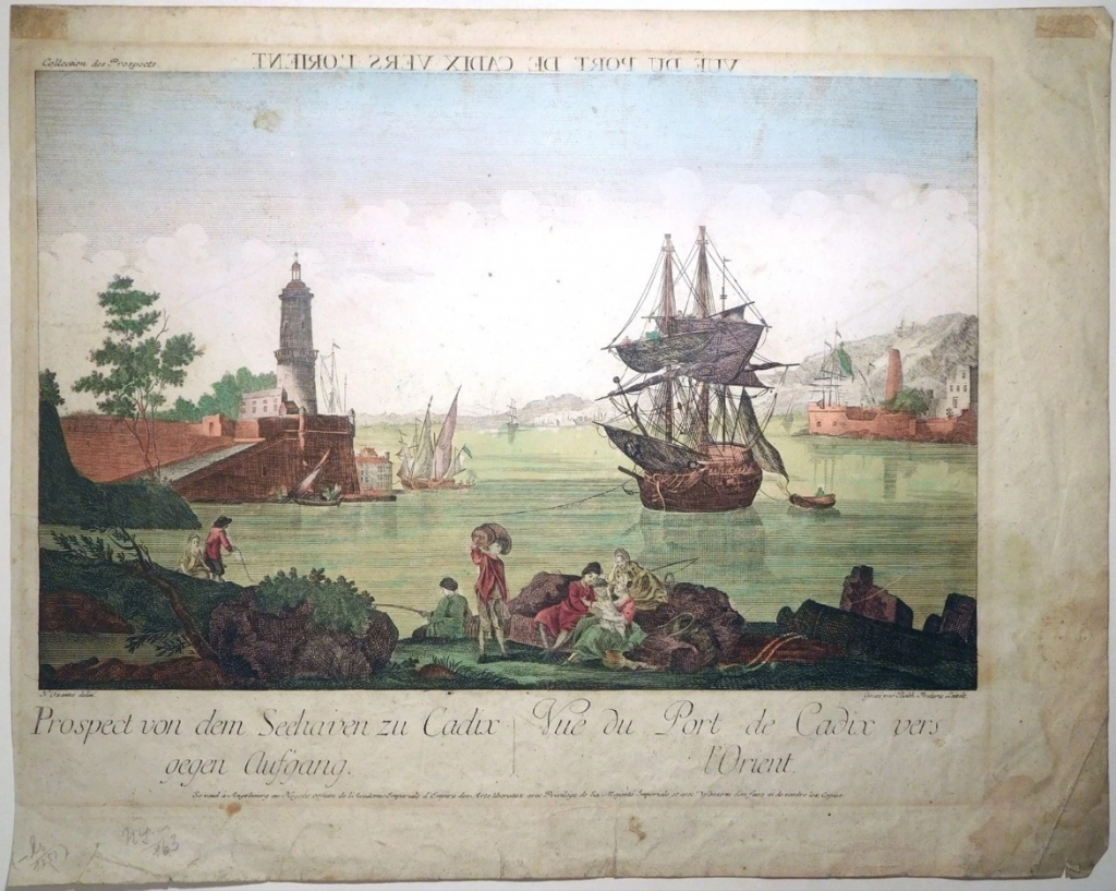 En la parte inferior izquierda, figura el nombre del ilustrador o dibujante de la vista, Nicolas Marie Ozanne (1728-1811), y en la inferior derecha, la firma impresa del grabador, Balthasar Friedrich Leizel (1755-1812). En la parte inferior central, se encuentran los títulos en alemán y francés. En francés: “Vue du port de Cadiz vers l’Orient” y “Vue du port de Cadix vers l’Occident. Y la dirección de la editorial de la Academia Imperial de Arte de Augsburgo, que ostenta el privilegio imperial de impresión y vernta.
