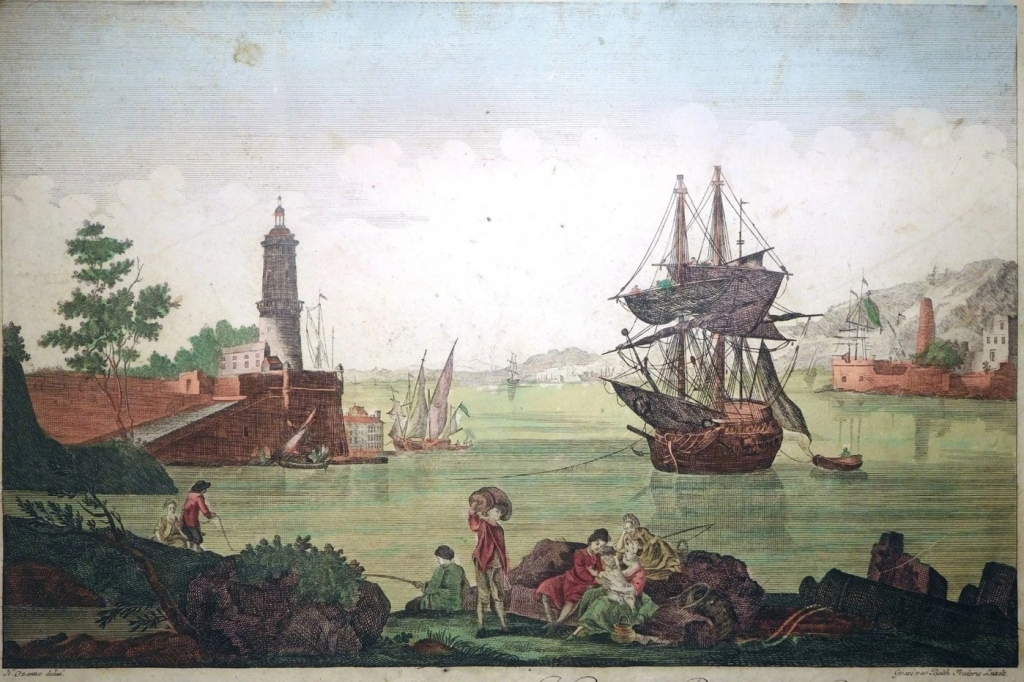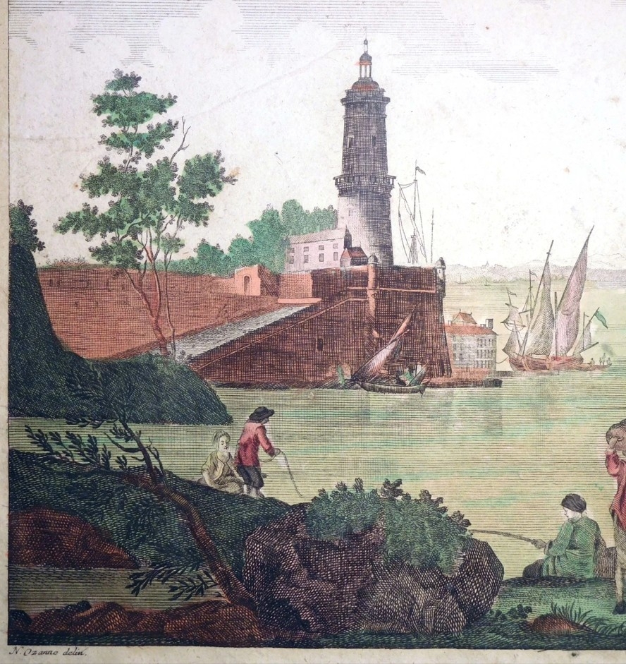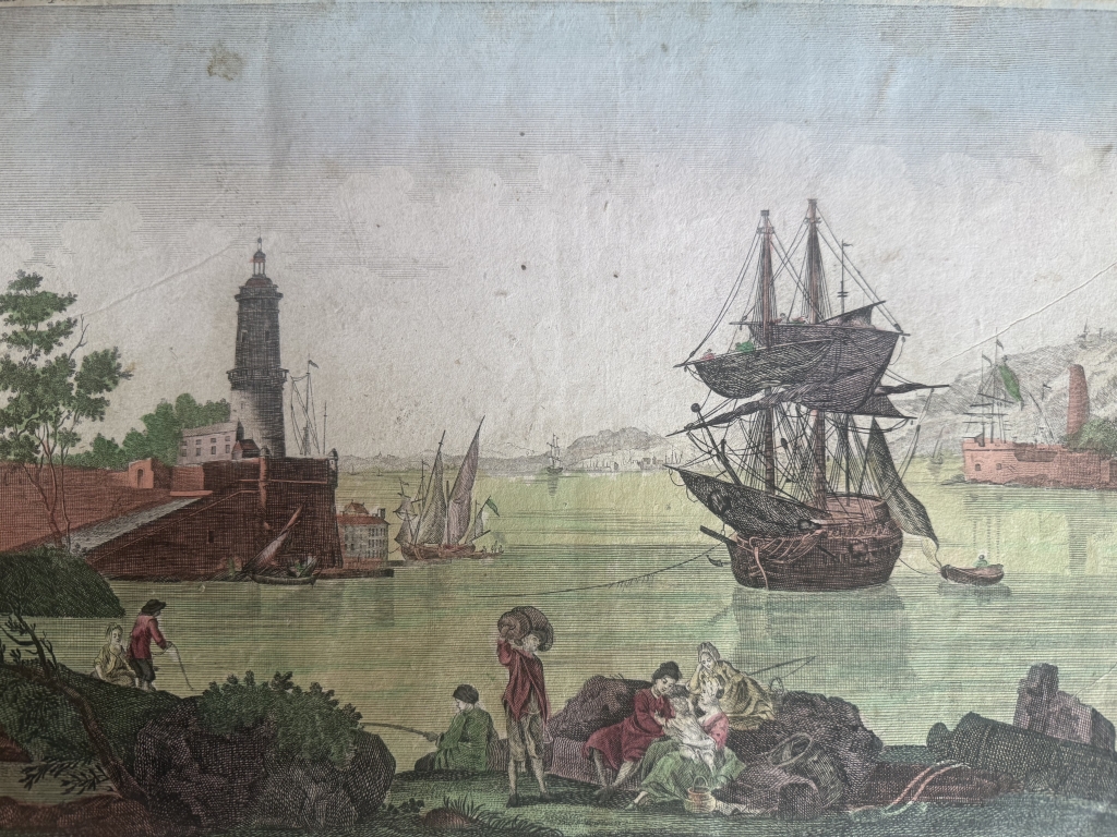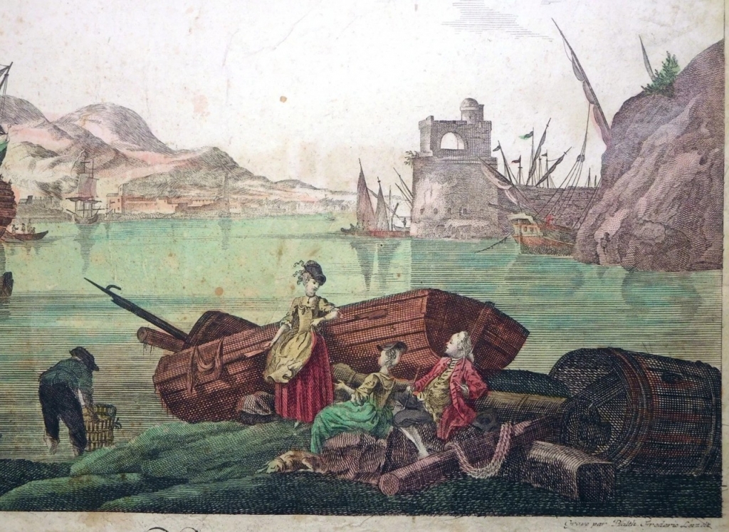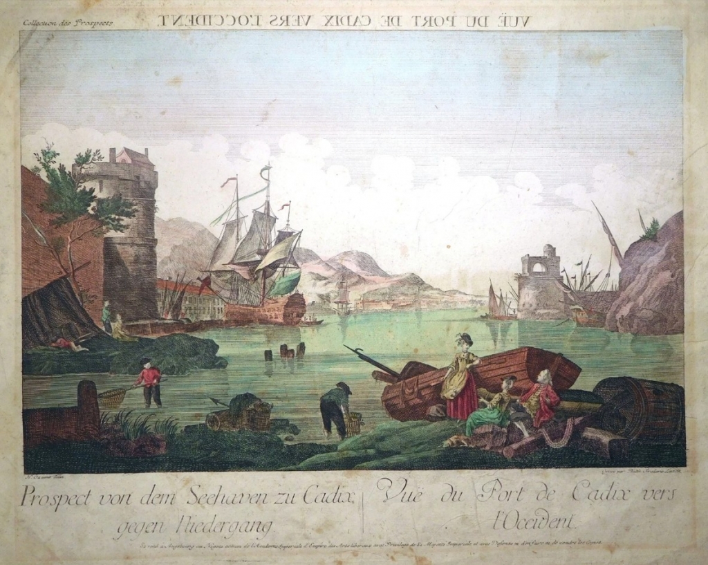 Dos grabados de placa de cobre, a color, en la misma hoja (uno por el anverso y el otro por el reverso) en que se nos ofrece dos vista de la ciudad y puerto de Cádiz, en Andalucía (España. Cada una muestra una sección del puerto desde diferentes ángulos, con varios barcos, partes de las fortificaciones y escenas cotidianas de sus habitantes hacia finales del siglo XVIII
