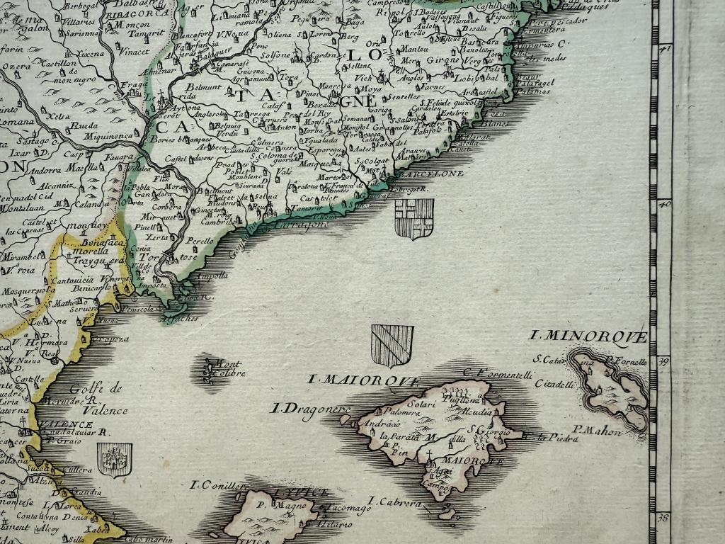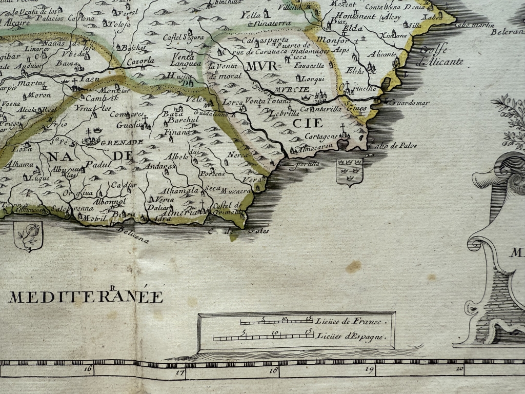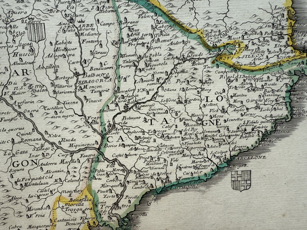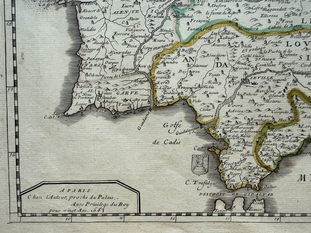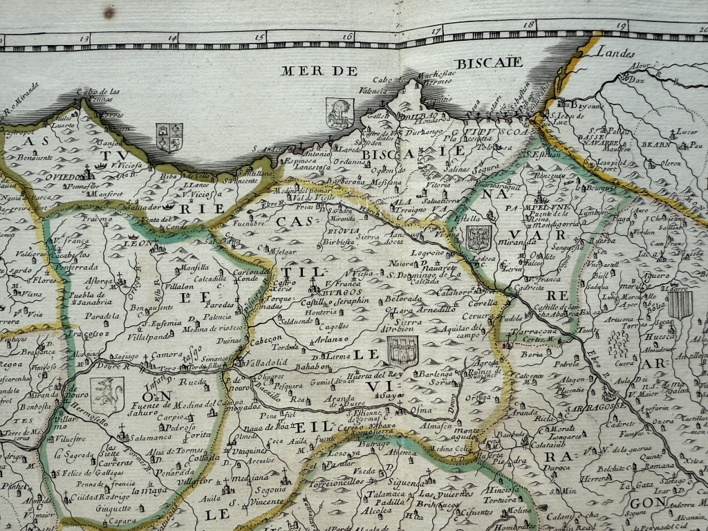 Descripción: Impresionante y muy detallado mapa inusual de la península ibérica grabado en cobre, a color, de Pierre du Val de 1663. Cubre España, Portugal, Gibraltar así como parte del sur de Francia y un poco de Marruecos.