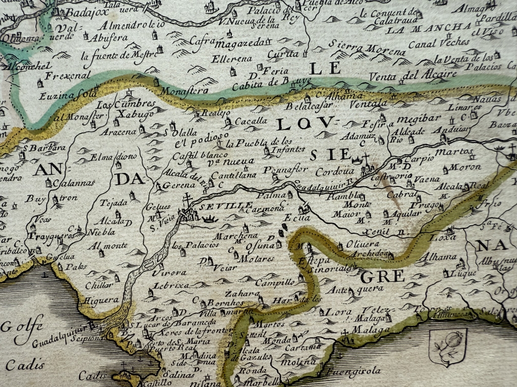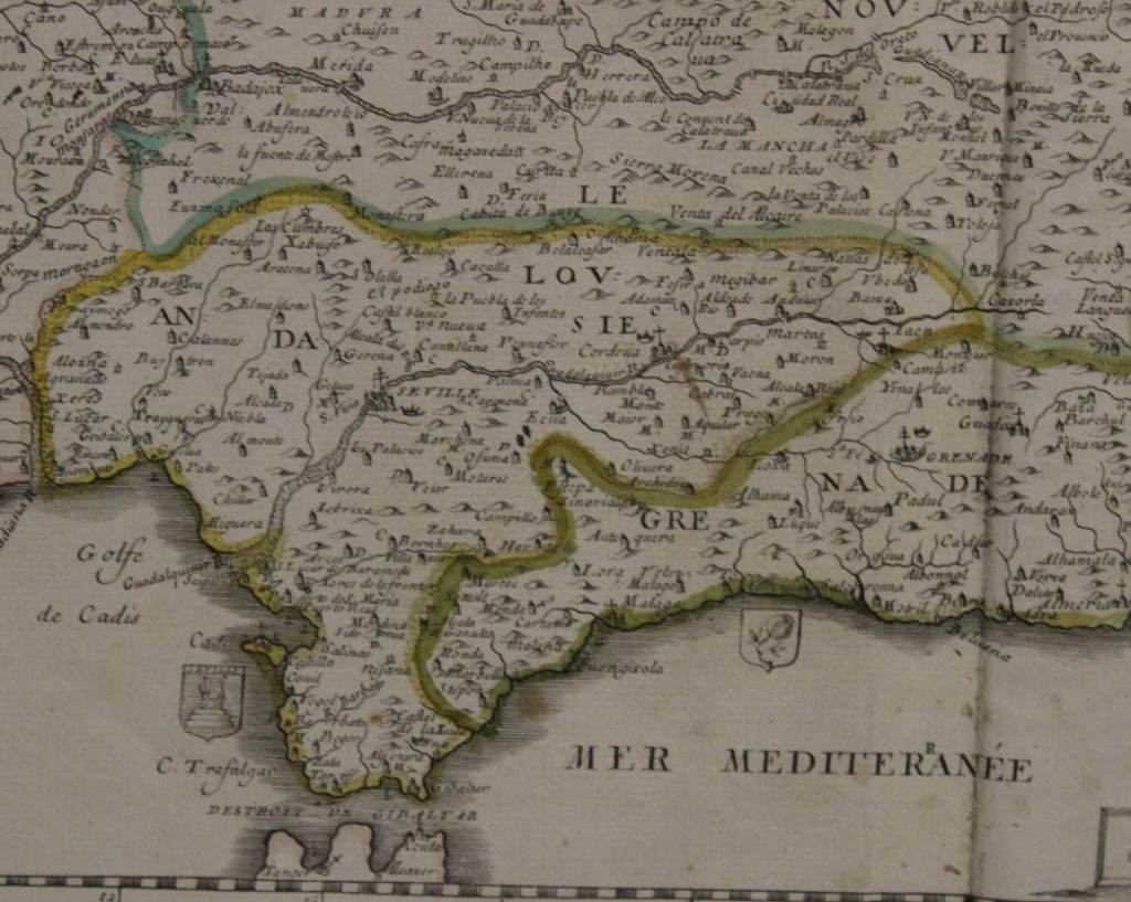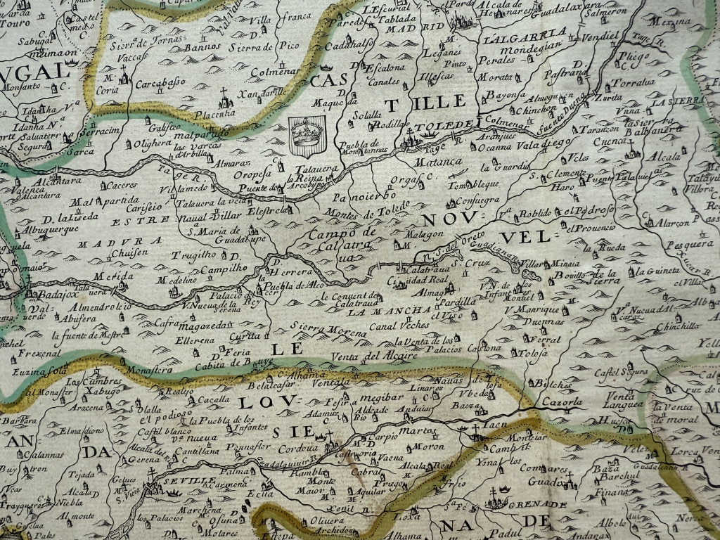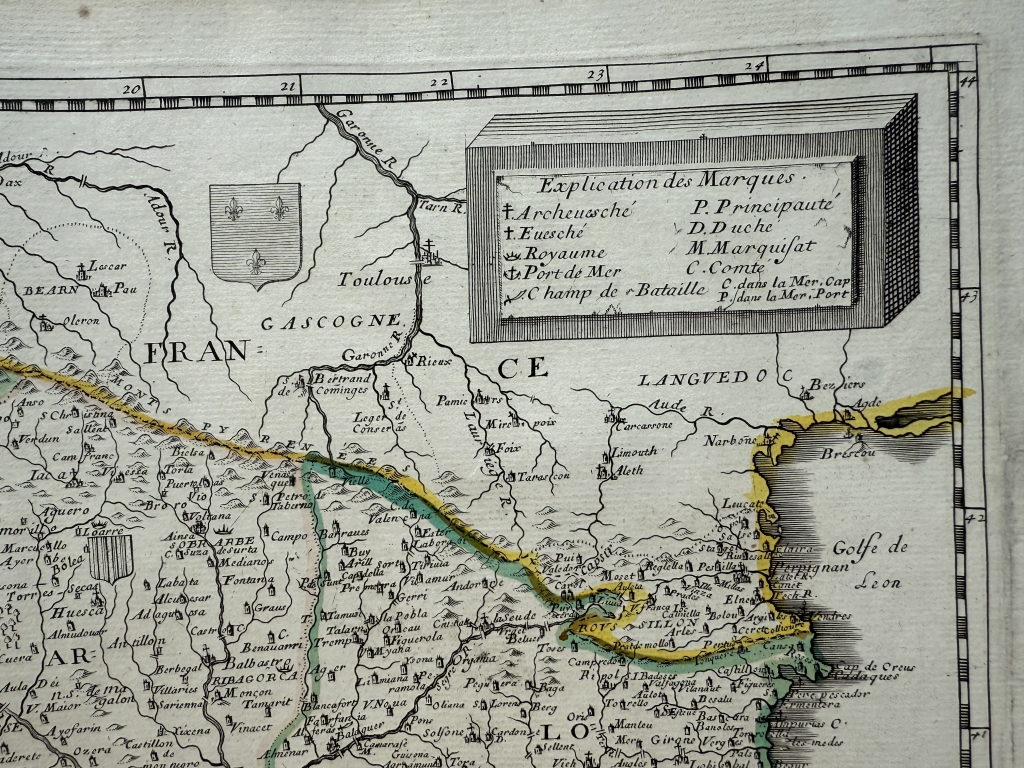 Descripción: Impresionante y muy detallado mapa inusual de la península ibérica grabado en cobre, a color, de Pierre du Val de 1663. Cubre España, Portugal, Gibraltar así como parte del sur de Francia y un poco de Marruecos.