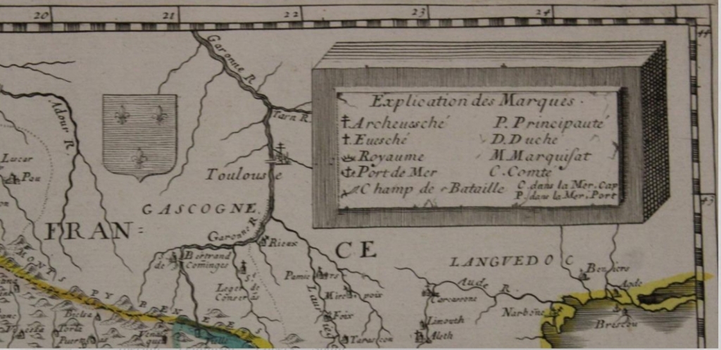 Fuente: Pierre Du Val. Cartes de geographie Les plus Nouvelles et les plus fideles, Auecque leurs Diuisions Régulieres, qui marquent les Bornes des Estats selon les derniers Traités de Paix. Por P. du-Val Géographe Ordinaire du Roy. A París: Chez l'Auteur, prés le Palais; Avec Privilège du Roy. M. DC. LXXI.