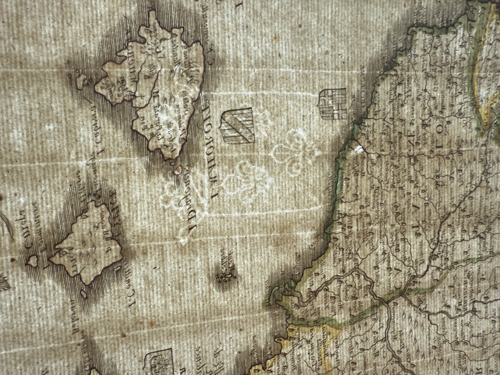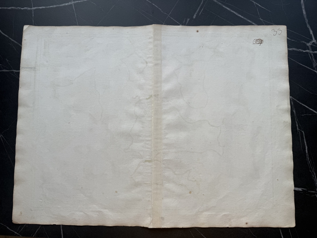 Condición y estado de conservación:: Impresión muy fuerte y oscura sobre buen papel. Papel con cadenas y marcas de alambre y con bella marca de agua (un escudo heráldico). Mapa antiguo original coloreado. Amplios márgenes. Mapa plegado original. Las condiciones son las que se pueden apreciar en las imágenes. Rara edición, muy procurado por coleccionistas.
