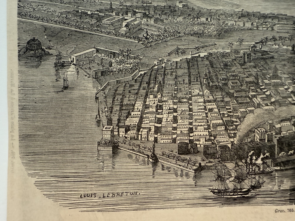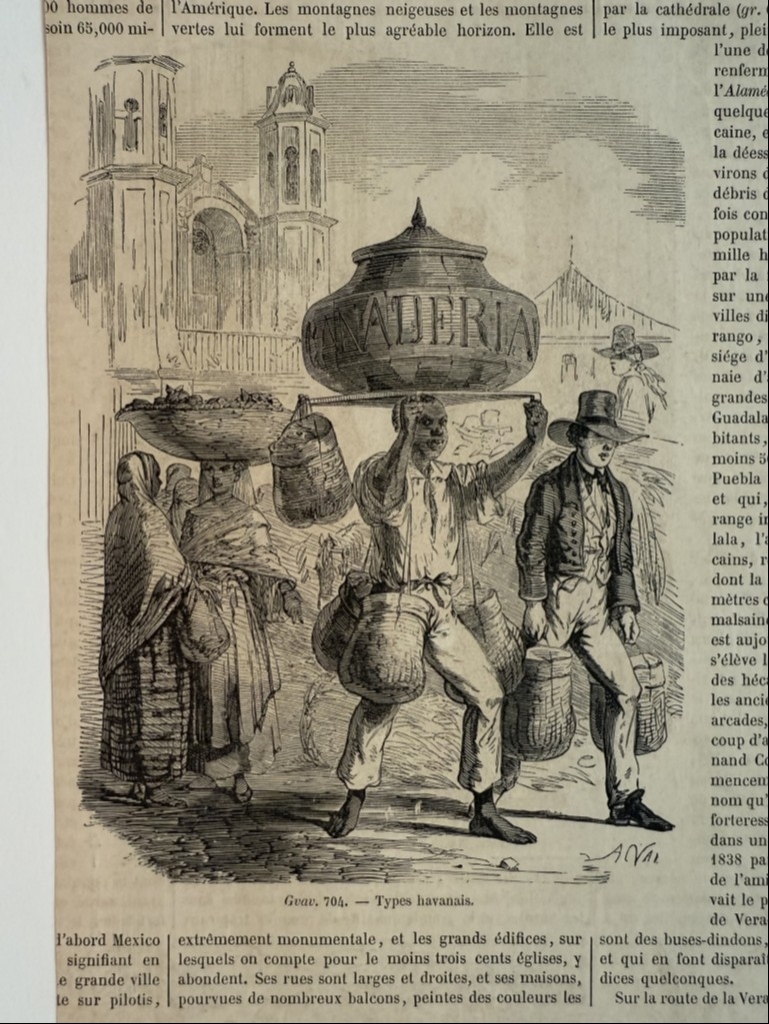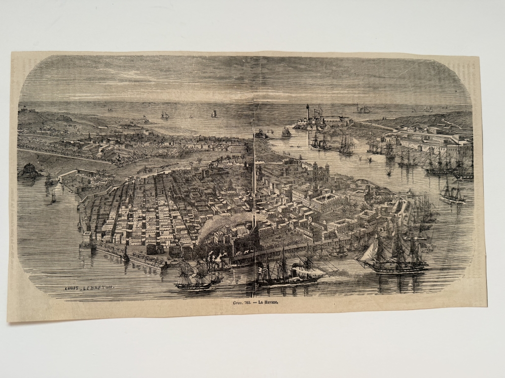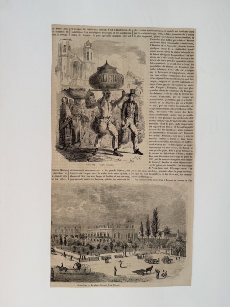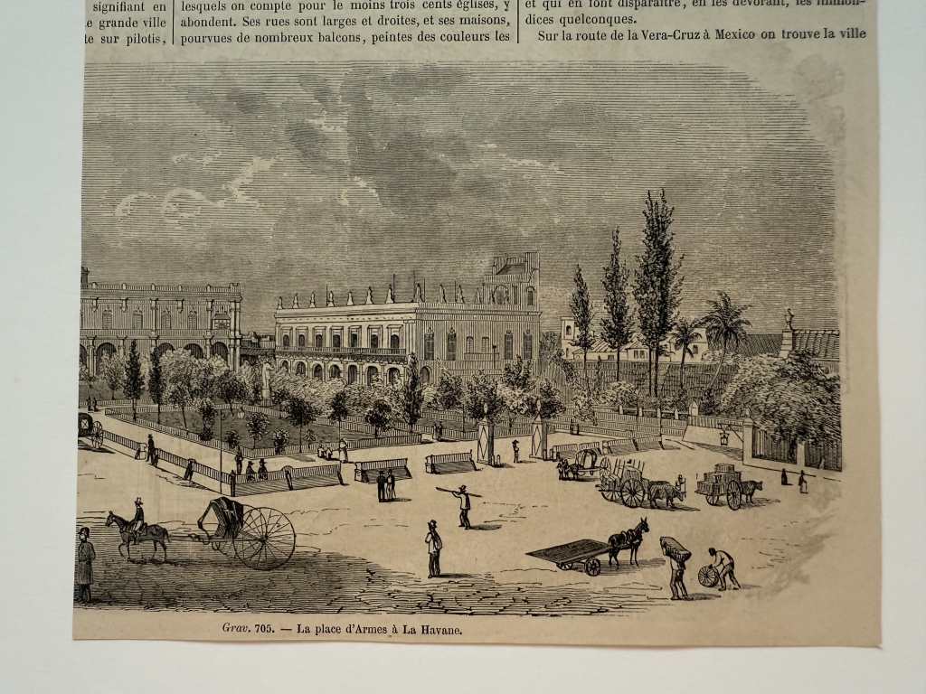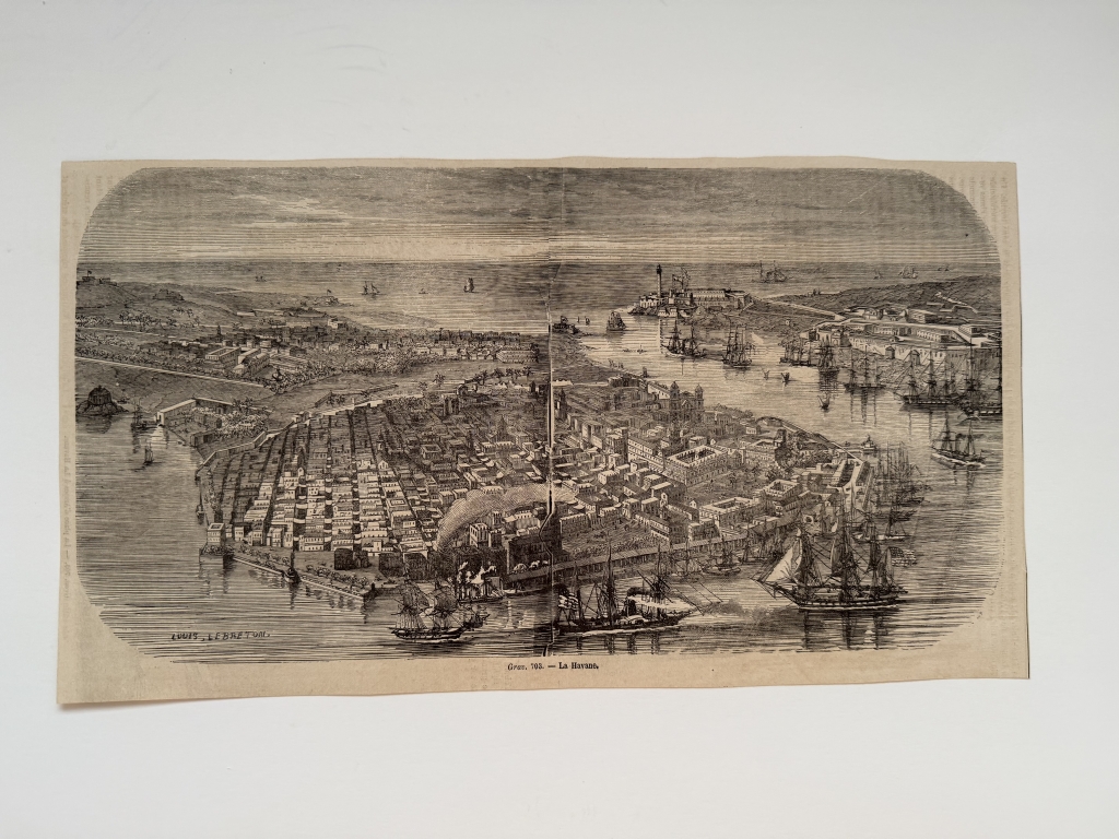 Hoja recortada de una publicación francesa editada hacia 1870, que presentan tres xilografías o grabados de placa de madera relacionados con La Habana, capital de la isla caribeña de Cuba (América). En el reverso, cuyo autor es Lebreton, podemos ver una bella vista aérea de esta ciudad y puerto, con toda su topografía y adonarnada con numeosas embarcaciones. Por el reverso, tenemos una que nos presentan diversos tipos de los habitantes de la localidad y en otra, algo recortado por un lado, una vista de la famosa Plaza de Armas, de la citada ciudad.