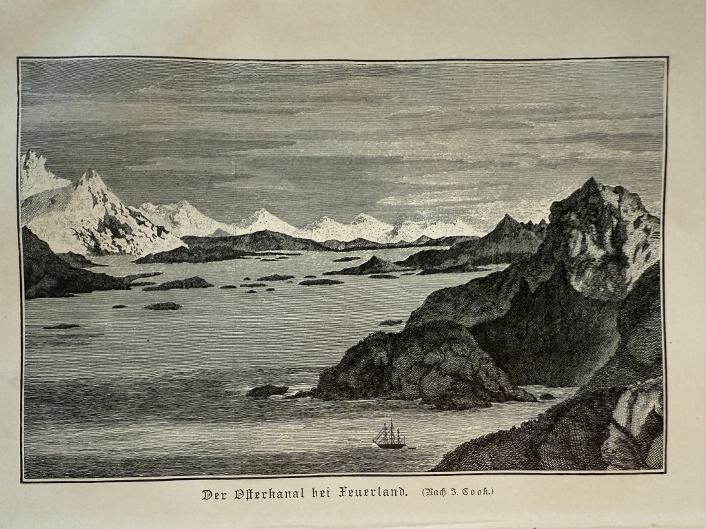 Se nos muestra una vista de la famosa Tierra de Fuego, en el sur de Argentina (América del sur), haciendo alusión al viaje del almirante Cook.