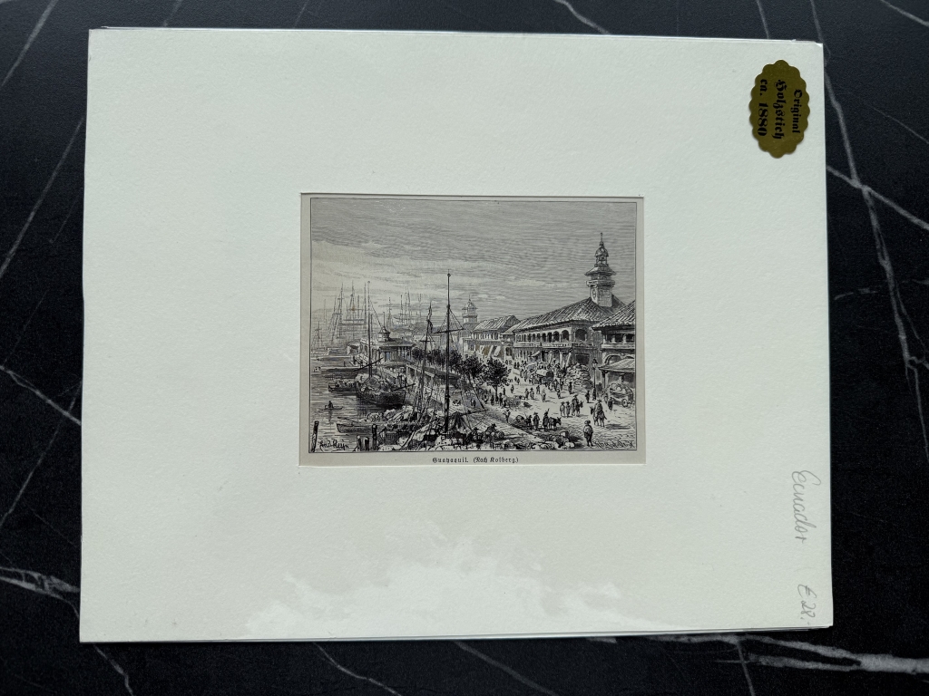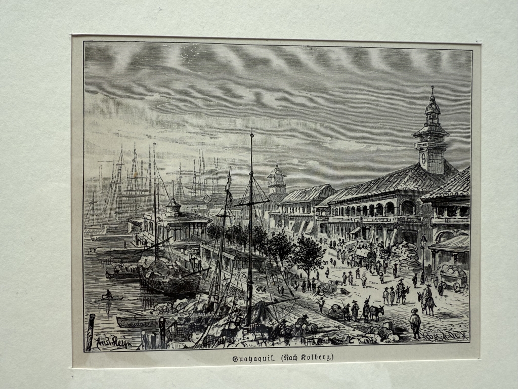 Se nos mustra una detalle del animado puerto y ciudad de Guayaquil, situada hacia la costa sur de Ecuador (América del sur), en la que nos muestran algunos pormenores de las construcciones yde los barcos allí atracados.