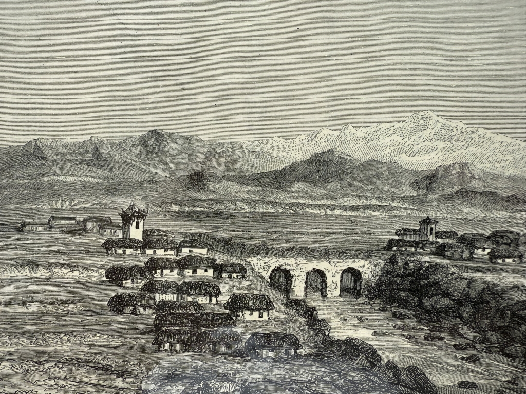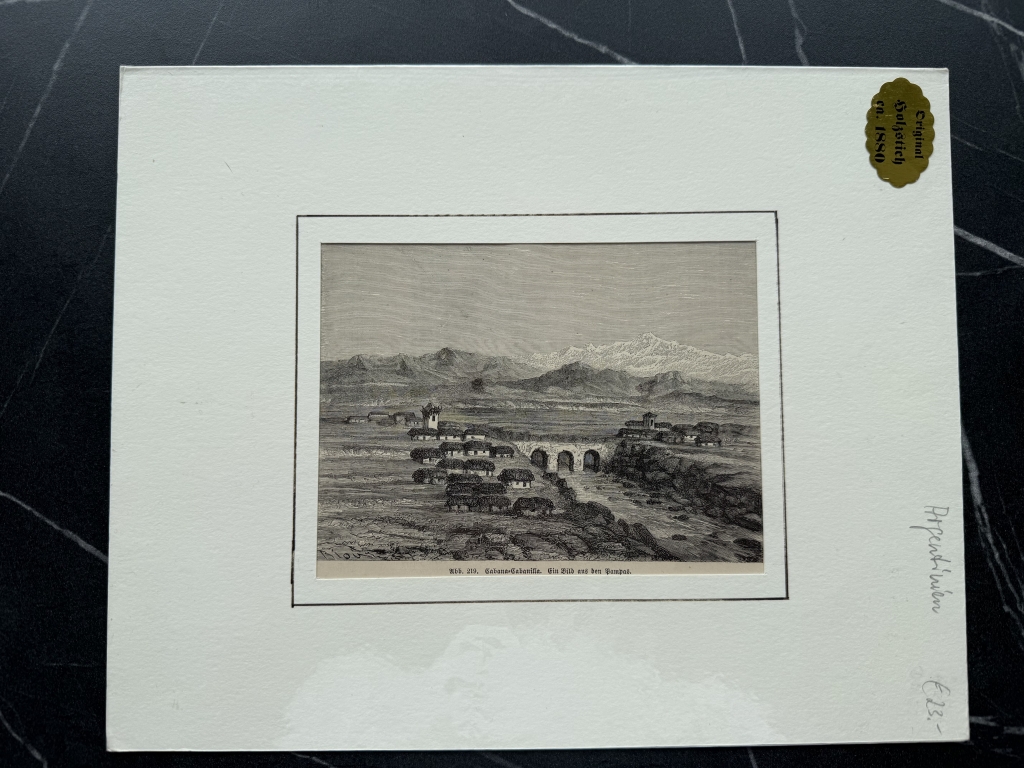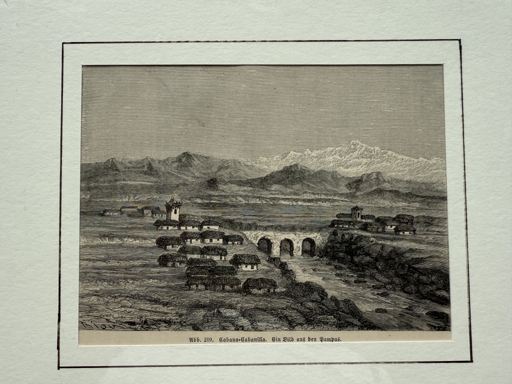 Con el título de Cabana=Cabanilla, en La Pampa (argentina, América del sur), se nos muestran varias construcciones al lado de un sólido puente y al fondo unas altas montañas.