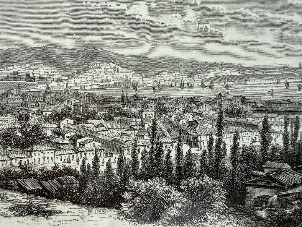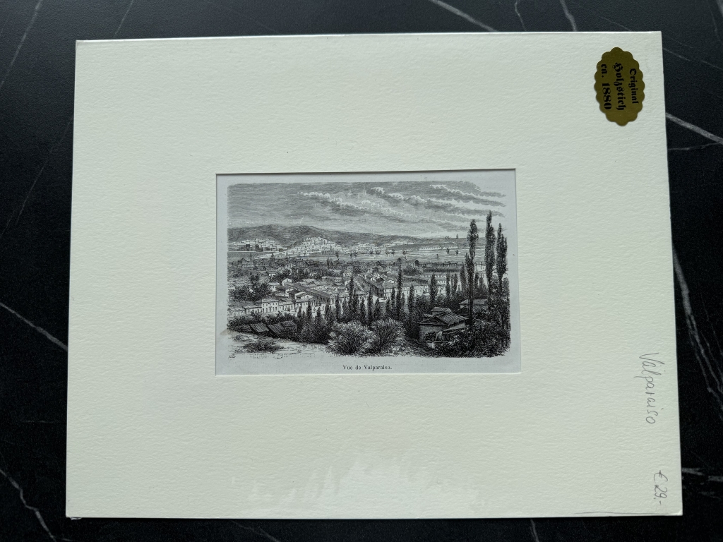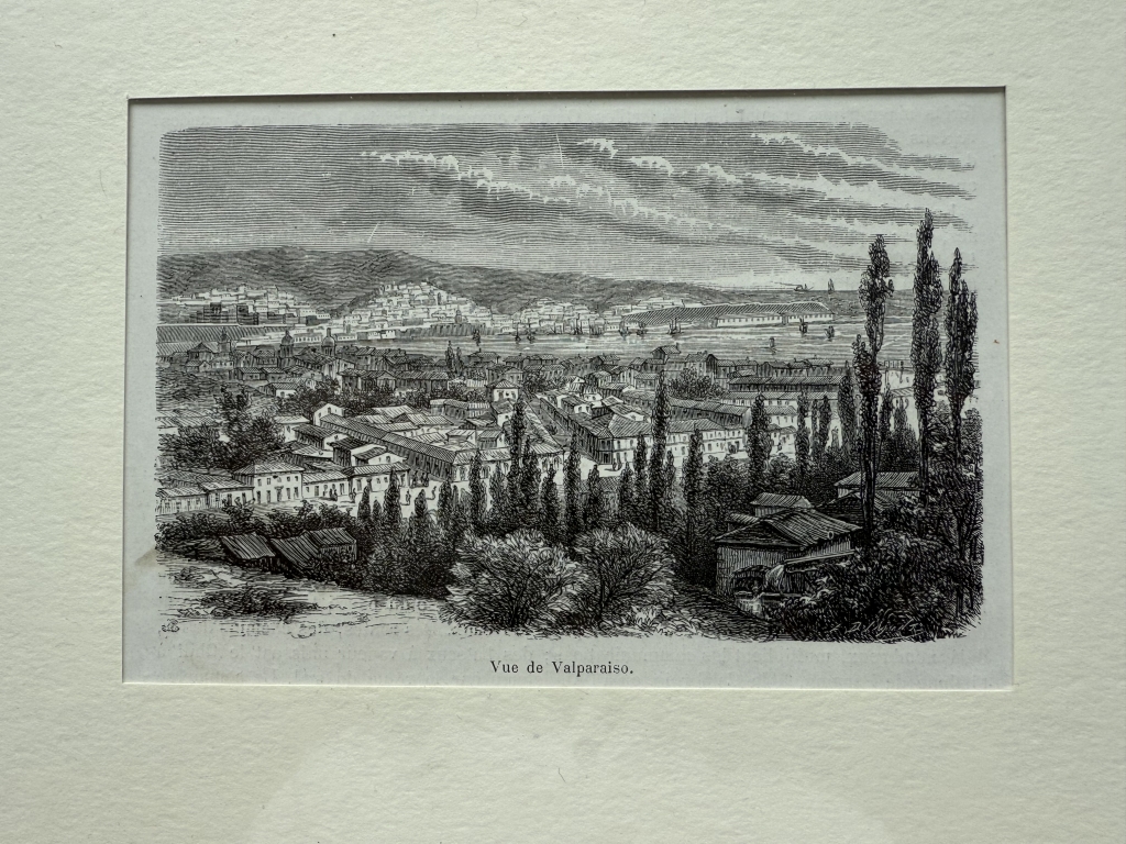 Se nos muestra una rara panorámica de la ciudad y puerto de Valparaíso, en la costa de Chile (América del sur), en la que se pueden observar los edificios más relevantes de esta localidady numerosos barcos de vela en su bahia.