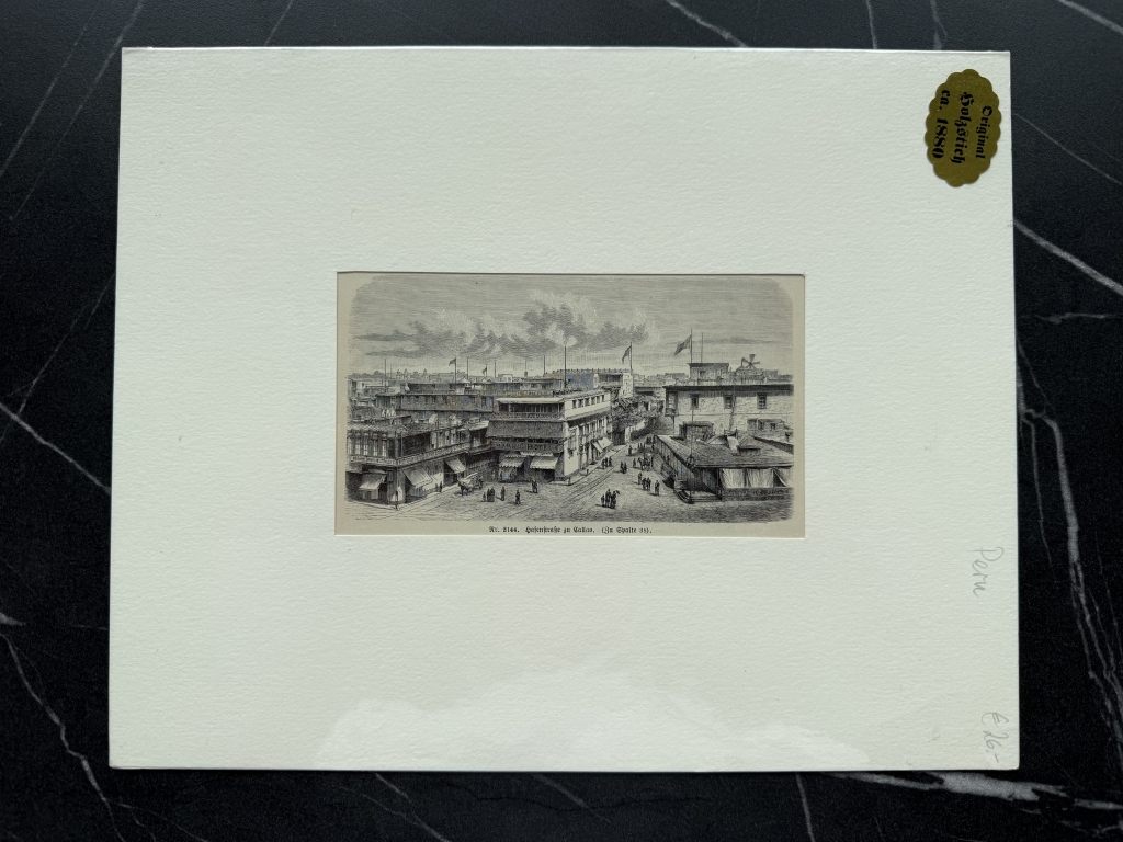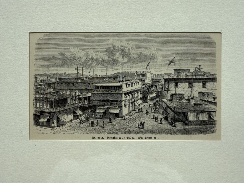 Se nos muestra con detalle parte del famoso puerto de El Callao, a la entrada de la capital de Perú, Lima (América del sur). Importante atraque para los barcos en dicha época, se nos presentan diversas construcciones que formaban parte del mismo.