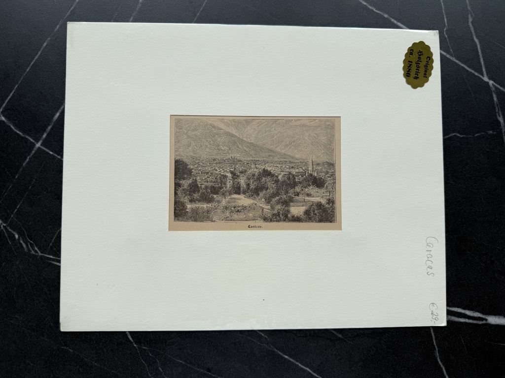 Se nos muestra una particular vista panorámica de caracas, capital de de Venezuela (América del sur). En ella podemos ver que aspecto urbanístico poseía la citada urbe hacia el ultimo tercio del siglo XIX.