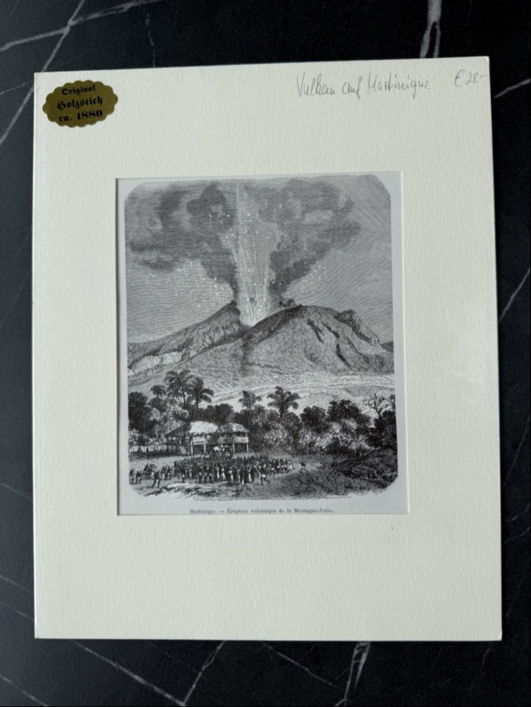 Se nos muestra la erupción del Monte Pelée en la isla de Martinica (mar Caribe, América), al fondo y una población indígena asustada al verla. La erupción más importante de este volcán se dió en 1902, por lo que si trata de ella, la publicación es posterior indublamente, pero podría tratarse de una anterior.