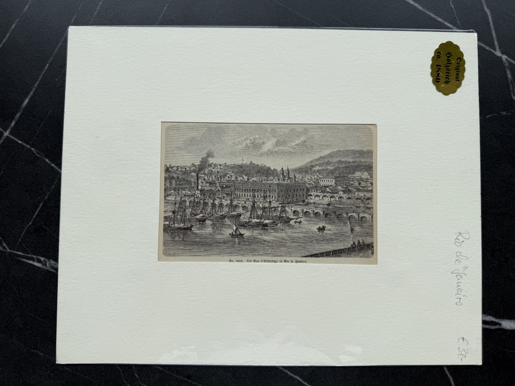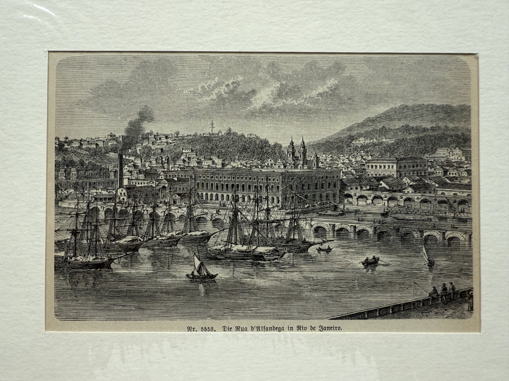 Se nos muestra un detalle de la ciudad y bahia de Río de Janeiro en Brasil (América del sur). En concreto la zona en la que se encuntraba la antigua aduana del puerto, pudiéndose ver con detalle numerosos edificios rfelevantes y embarcaciones.