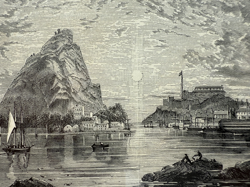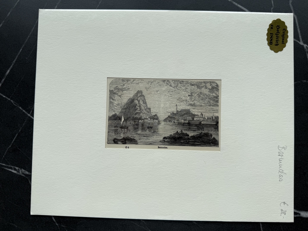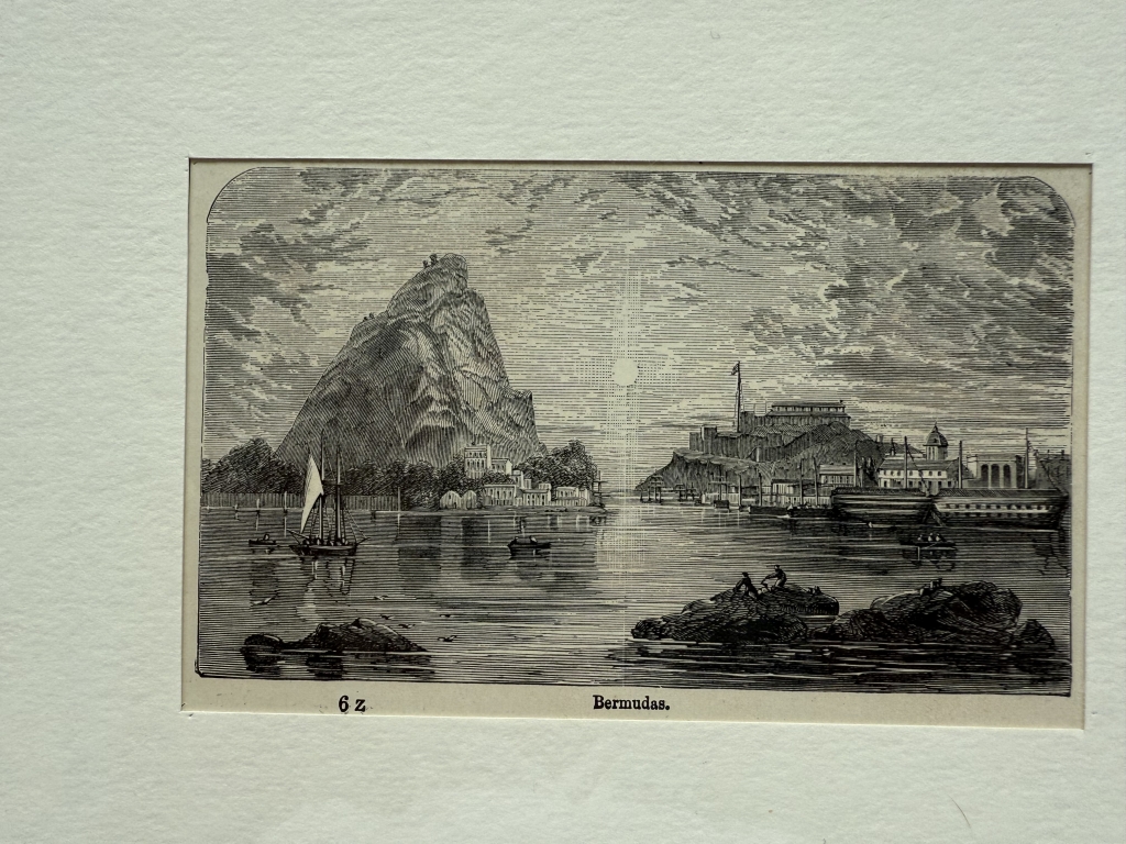Se nos muestra una interesante parte de la isla de las Bermudas (mar Caribe, América), que nos muestra en la parte central un abrupto pico montañoso y a sus lados, diferentes construcciones y embarcaciones.