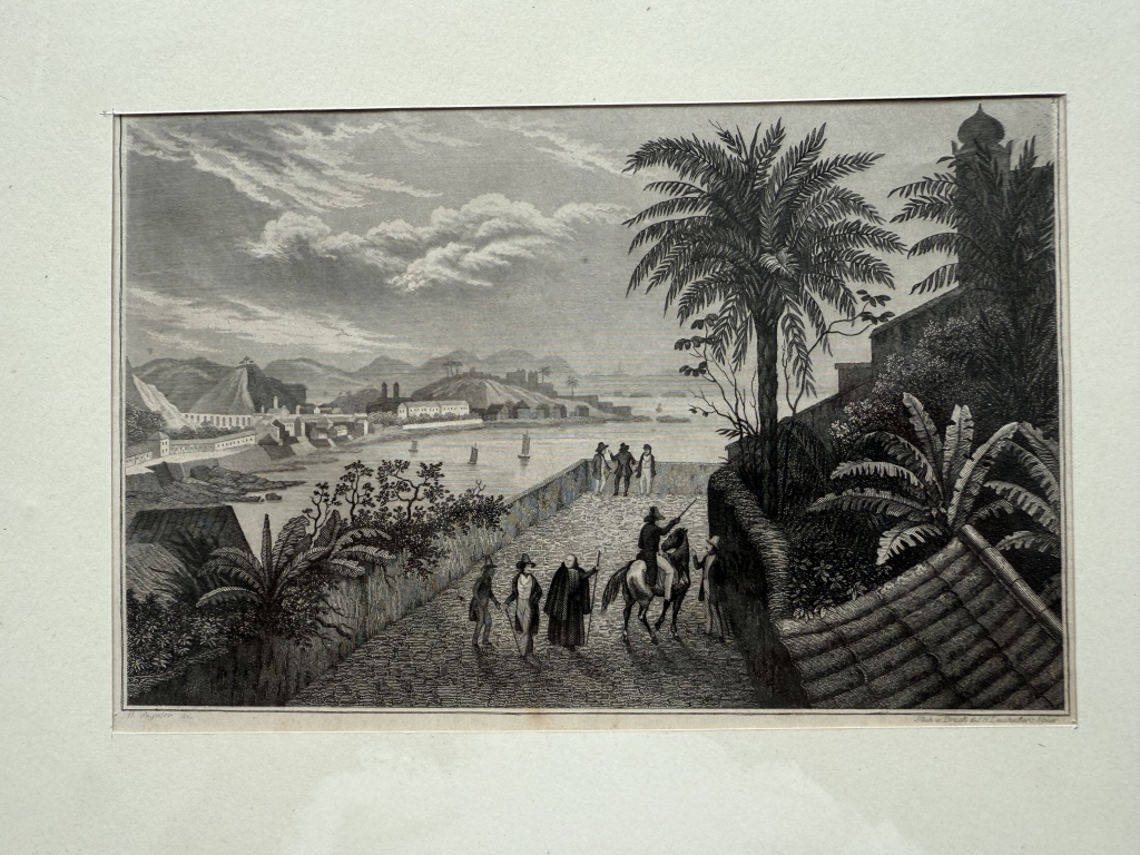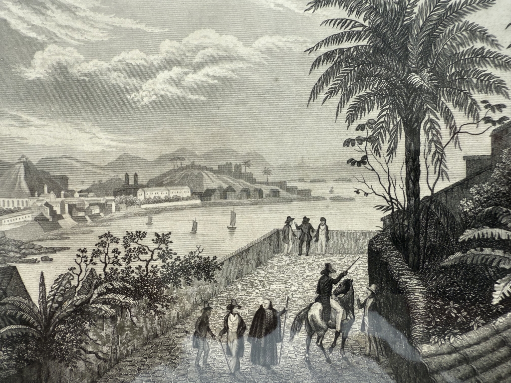 Se nos muestra una vista panorámica poco habitual de la bahia, ciudad y puerto de Río de Janerio, en Brasil (América del sur), con varios personajes en primer término.