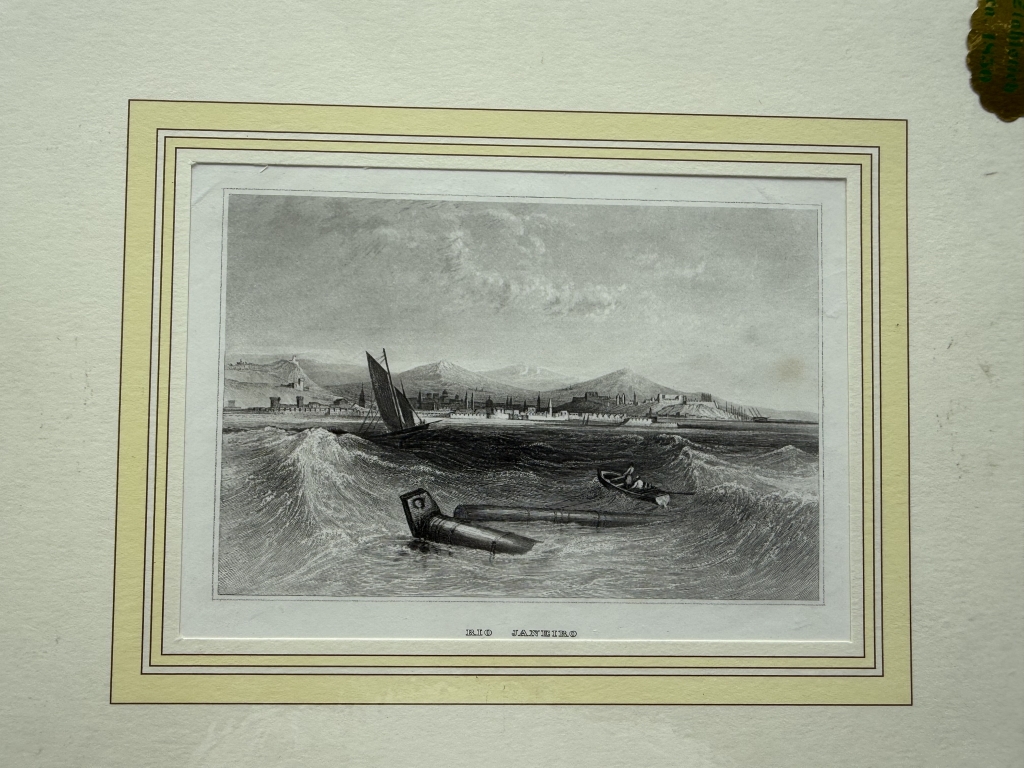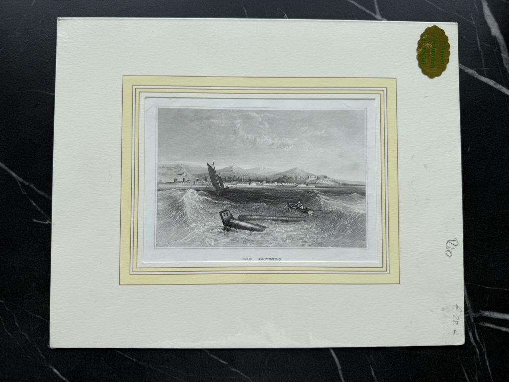 Podemos ver representada una fuerte tempestad en la bahía de Río de Janeiro (Brasil, América del sur)), con la ciudad al fondo y detalles de los destrozos y varias embarcaciones. Debajo tenemos el título.