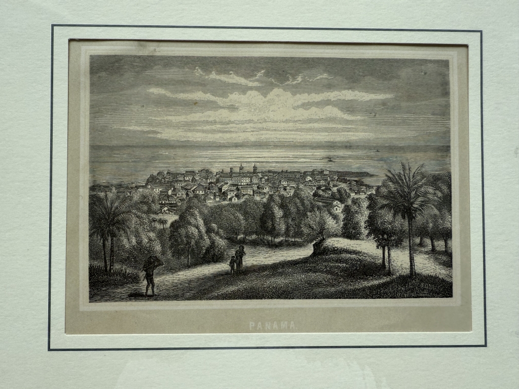 Esta bella imagen nos muestra una vista panorámica de la ciudad y puerto de Panamá (Panamá, América del sur), desde una posición poco habitual: desde tierra firma , al fondo la ciudad y el mar al fondo. En primer término, varios personajes en su vida cotidiana.
