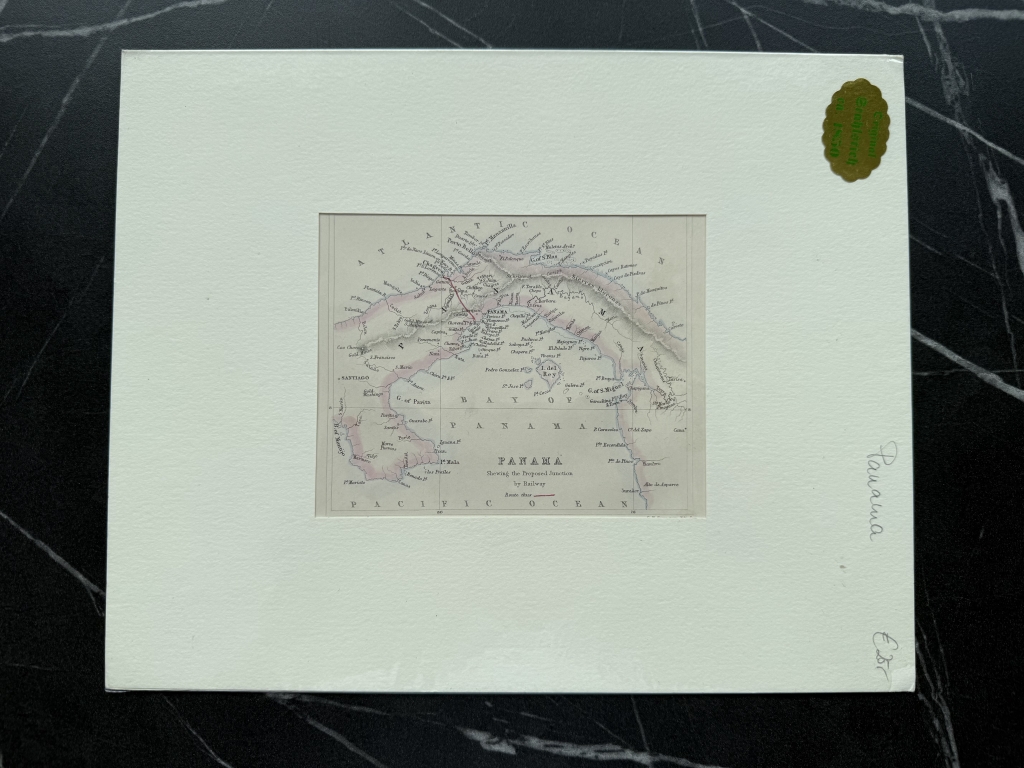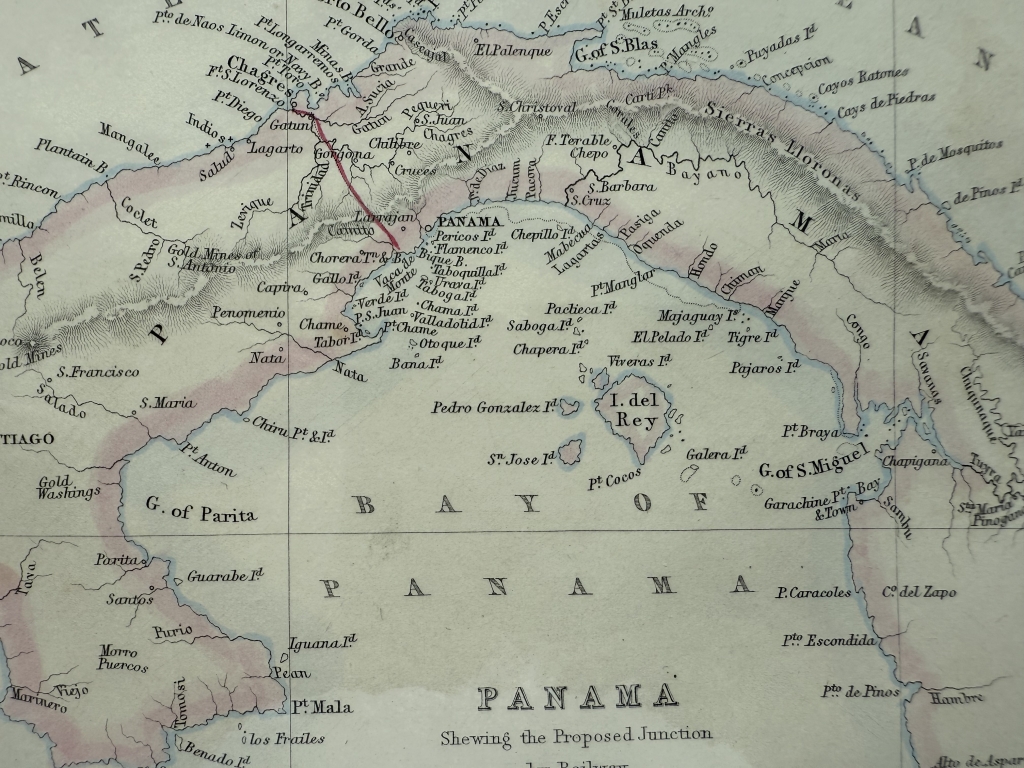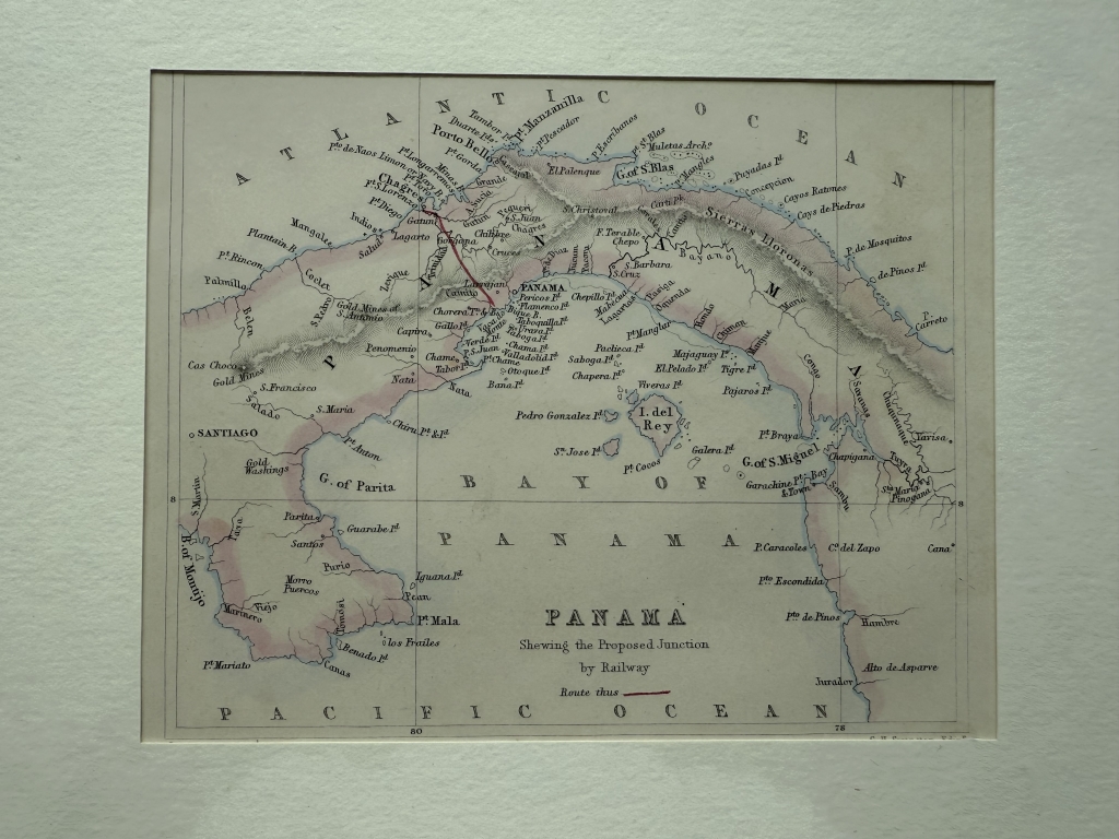 En este grabado a color sxe nos muestra en el mapa de Panamá (América central), la propuesta dada por la Railway, sobre el canal que se planteaba construir para unir el mar caribe con el océano Pacífico.