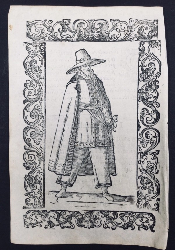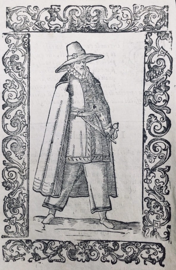 El grabado muestra al prototipo de un hombre de Galicia (España), con su traje típico, rodeado de una bella decoración renacentista. De pié, con sombrero ancho, capa, túnica y espada al cinto.