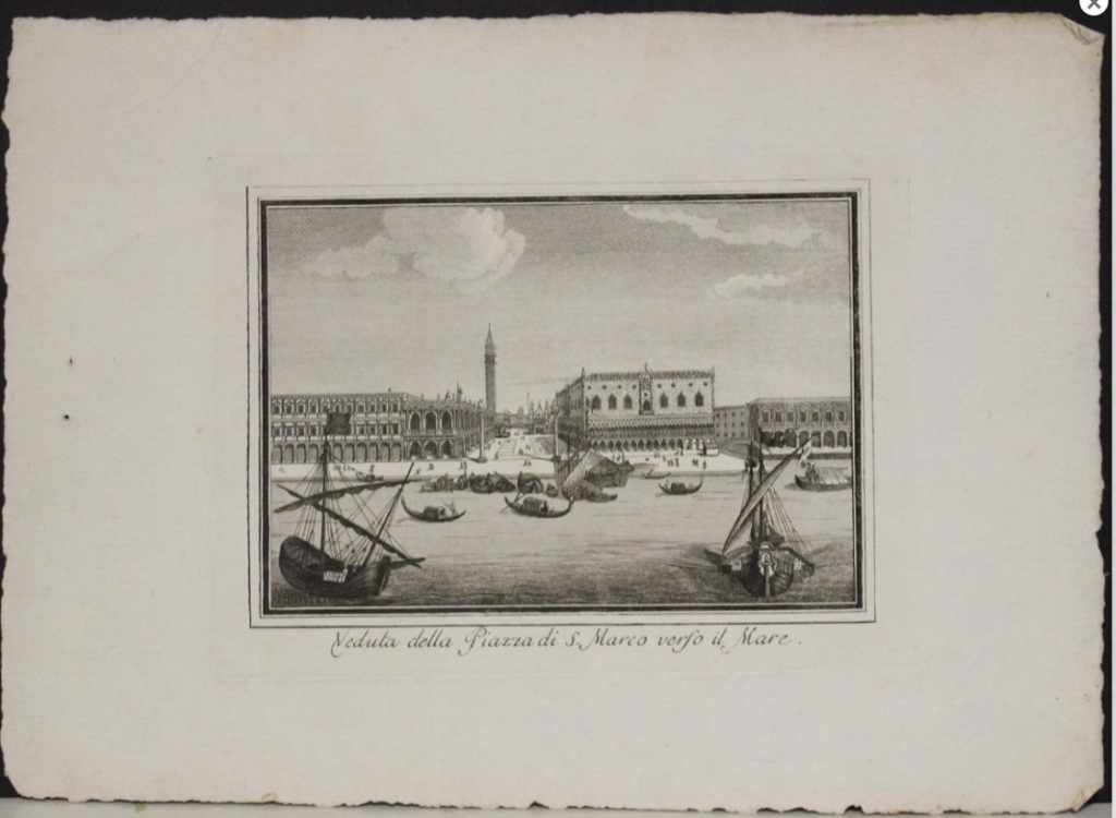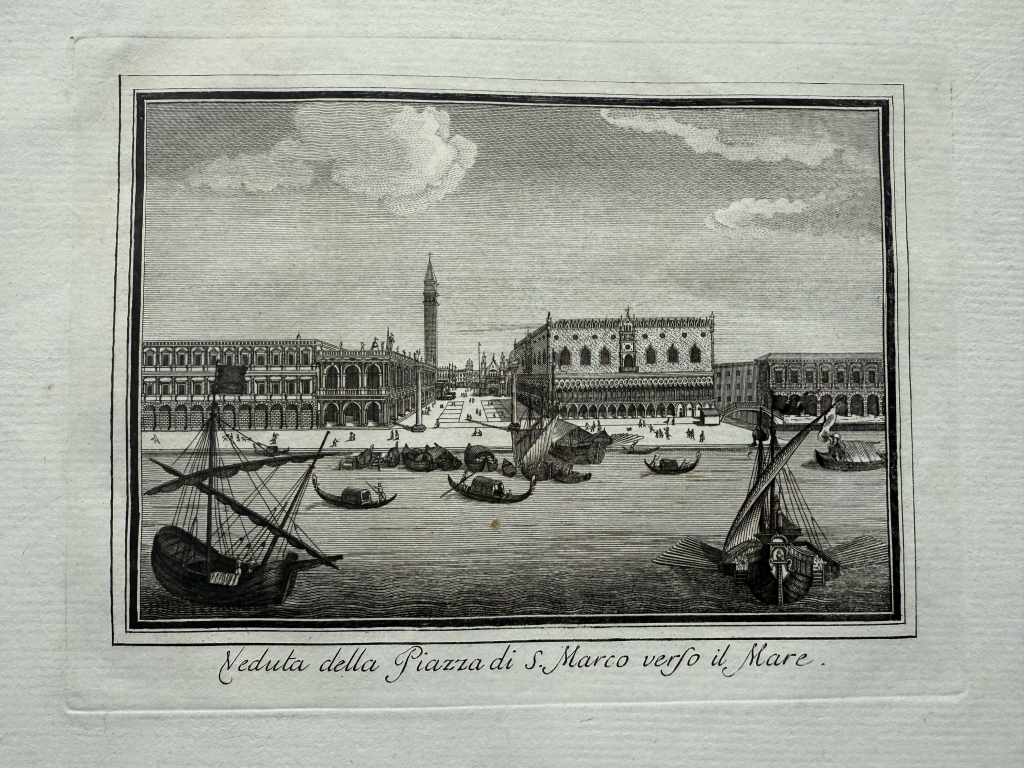 Descripción: Impresionante y detallada vista original grabada en cobre de la Piazza San Marco en Venecia, Italia. Varios habitantes y barcos adornan la vista.