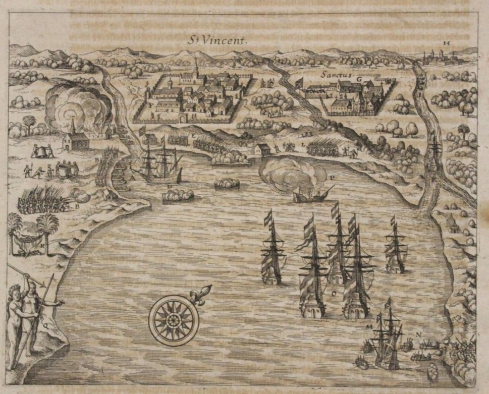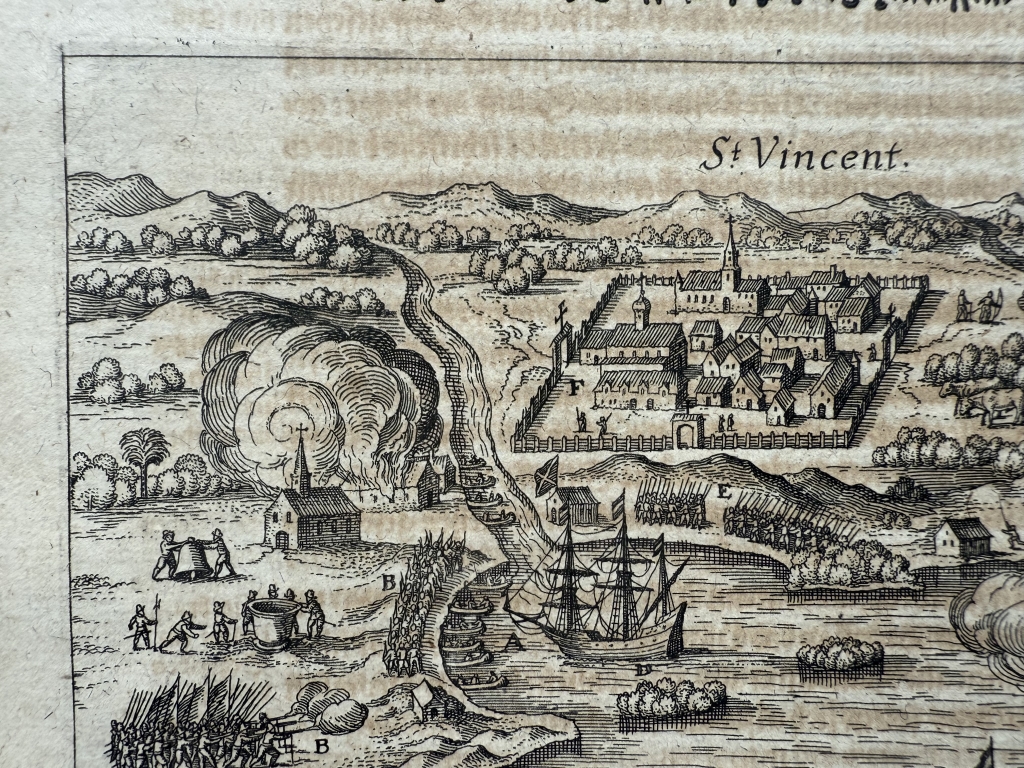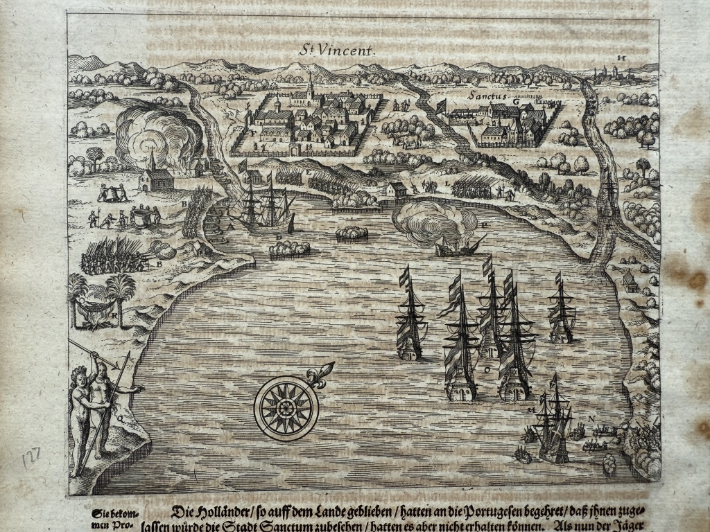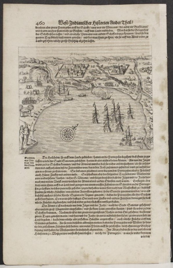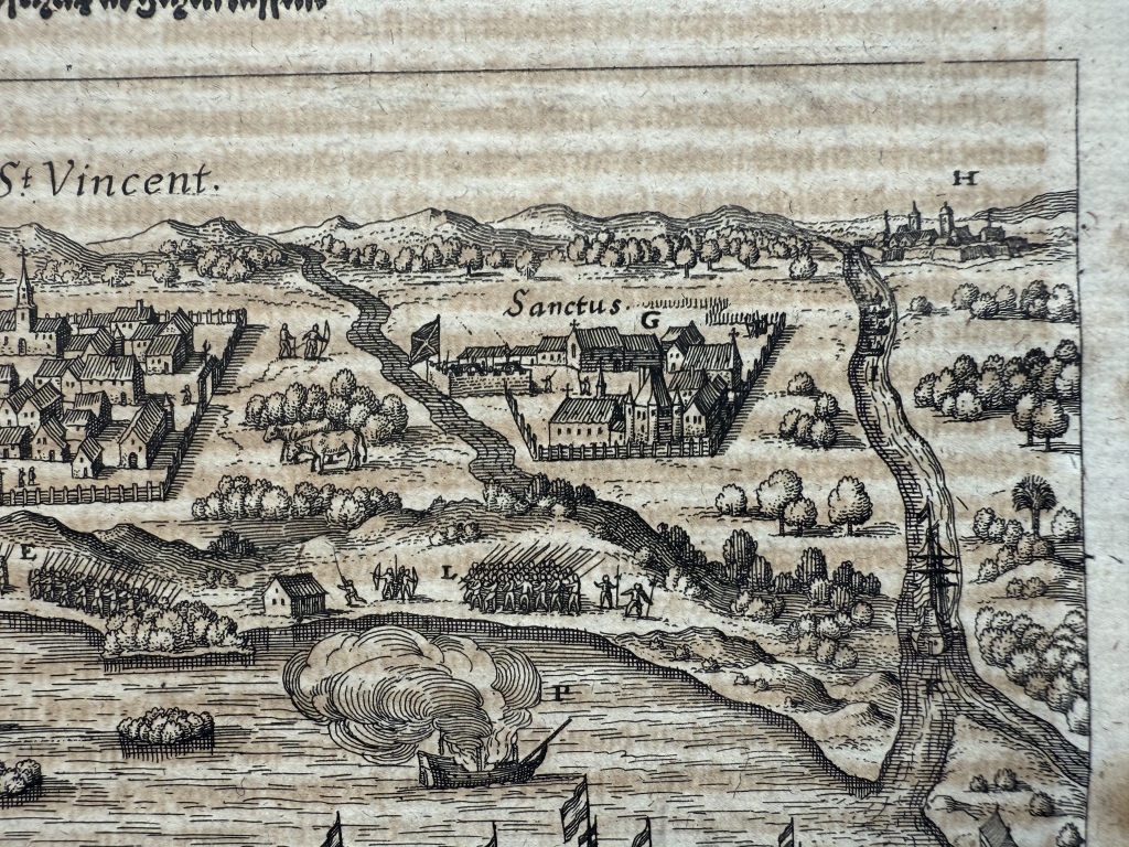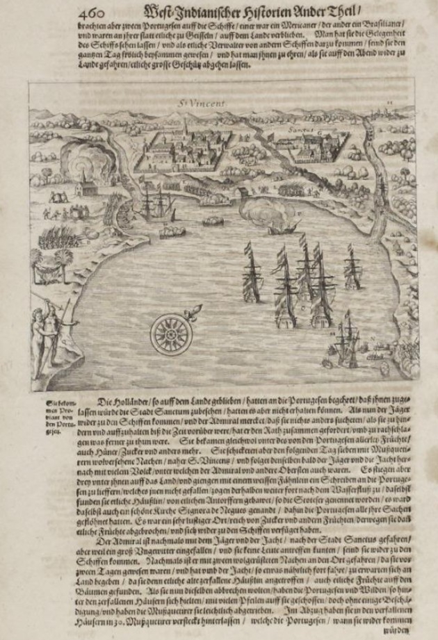El mapa muestra la ciudad y puerto de San Vicente, en la isla del mismo nombre, cerca del actual puerto de Santos en el límite del estado Sao Paulo en Brasil (América del sur). Vemos en esta cartografía orientada al norte, desde el mar, en primer término varios barcos y al fondo la localidad en si, con varios episodios que narra realmente la llegada de la flota de Joris van Spilbergen (1568-1620) a este lugar y los hechos bélicos que acontecieron: quema de casas, peleas entre tropas,..