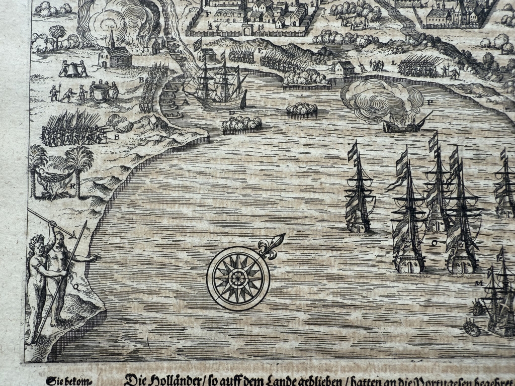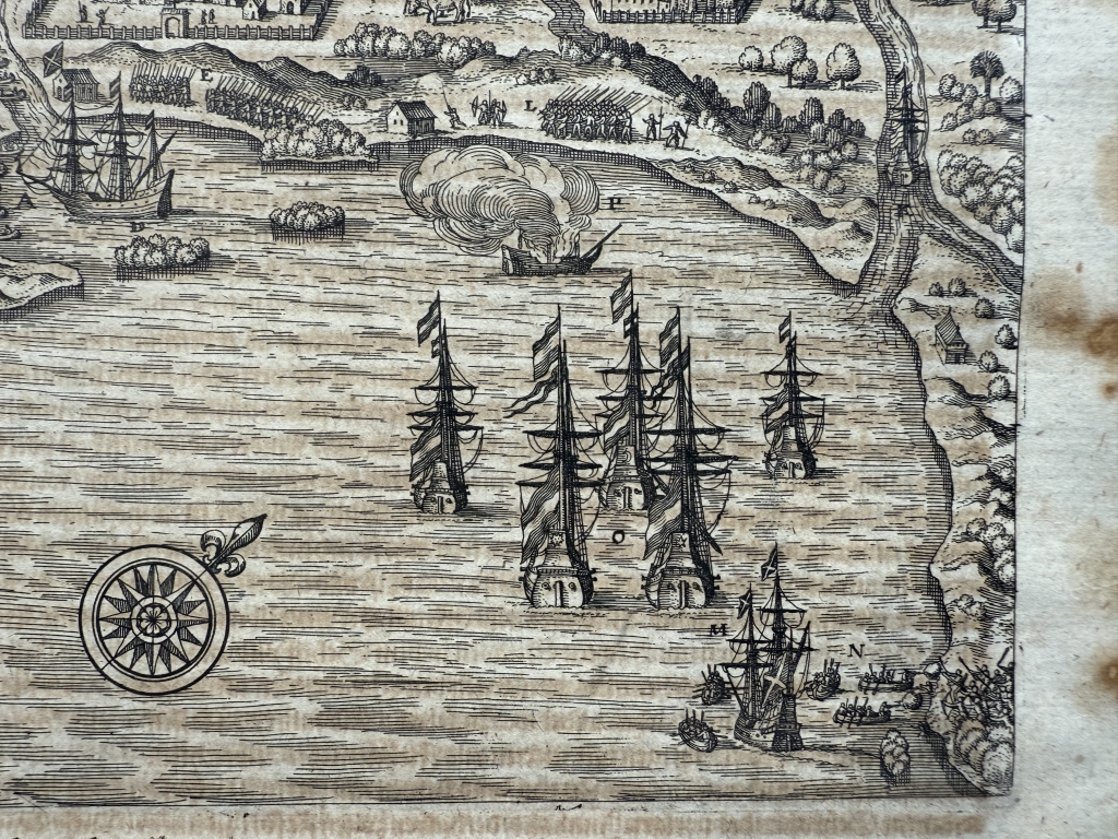 Descripción: Impresionante y detallada escena inusual, grabada en cobre en 1631, que muestra la flota de Joris van Spilbergen, entrando a São Vicente, Brasil.